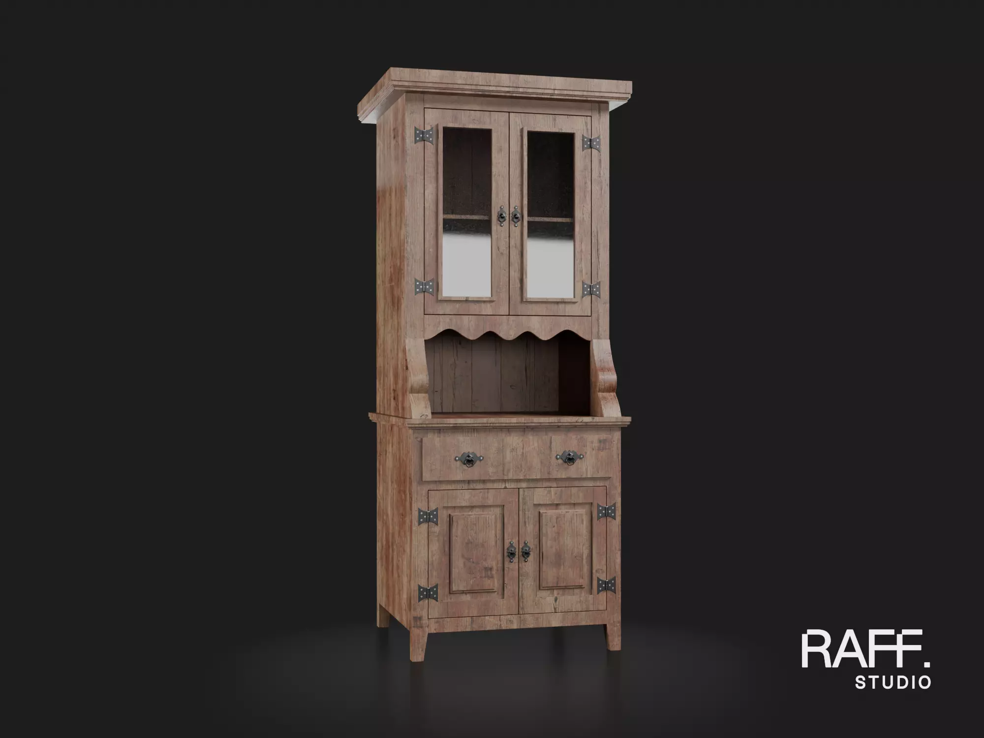 A small rustic cabinet modeled with realistic proportions and a clean, organized structure, designed for compact interior layouts while maintaining functional details such as doors, drawers, and metal hardware.The asset uses PBR materials with textures baked into a single 8K texture atlas, suitable for interior visualization, architectural scenes, and real-time applications.