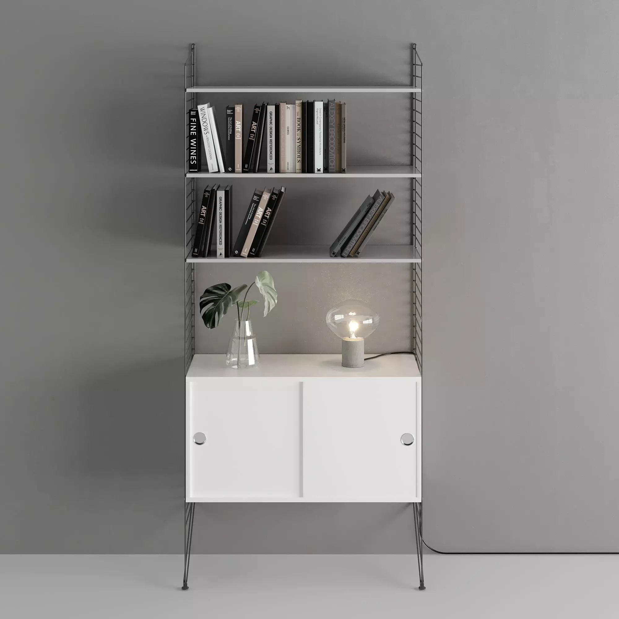 String shelf system with 2 sliding cabinet doors based on the design of Nils Strinning super flexible, distinctive andminimalist shelving system.OBS! the elements on this shelf system is not within this file (just for showcasing purposes).