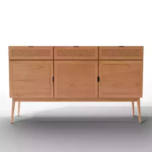 Key Features: It features a distinctive tapered leg design and woven cane/rattan detailing on the front of the three top drawers.