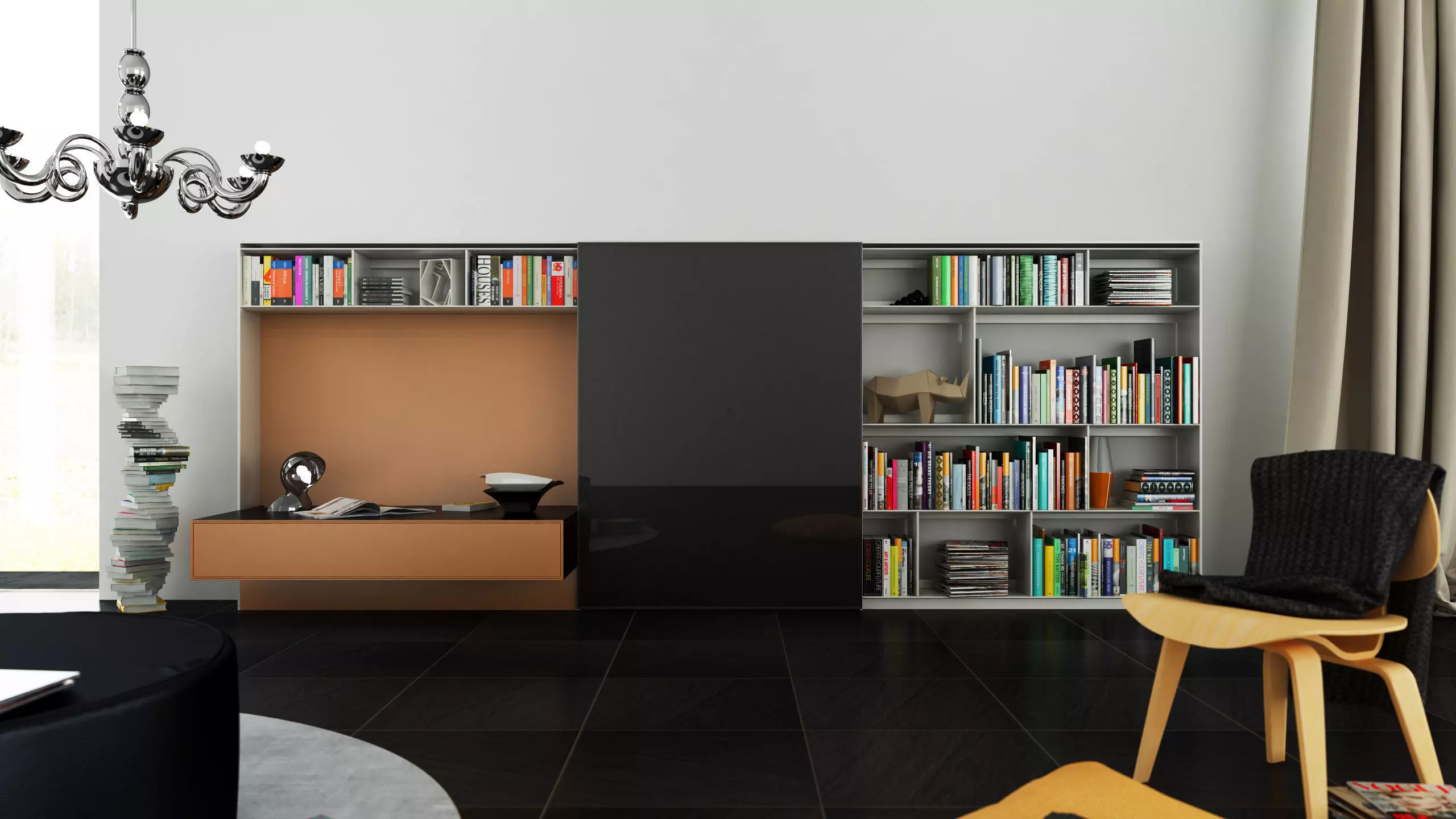 In the model there aren't scenes, bookcases and various objects.