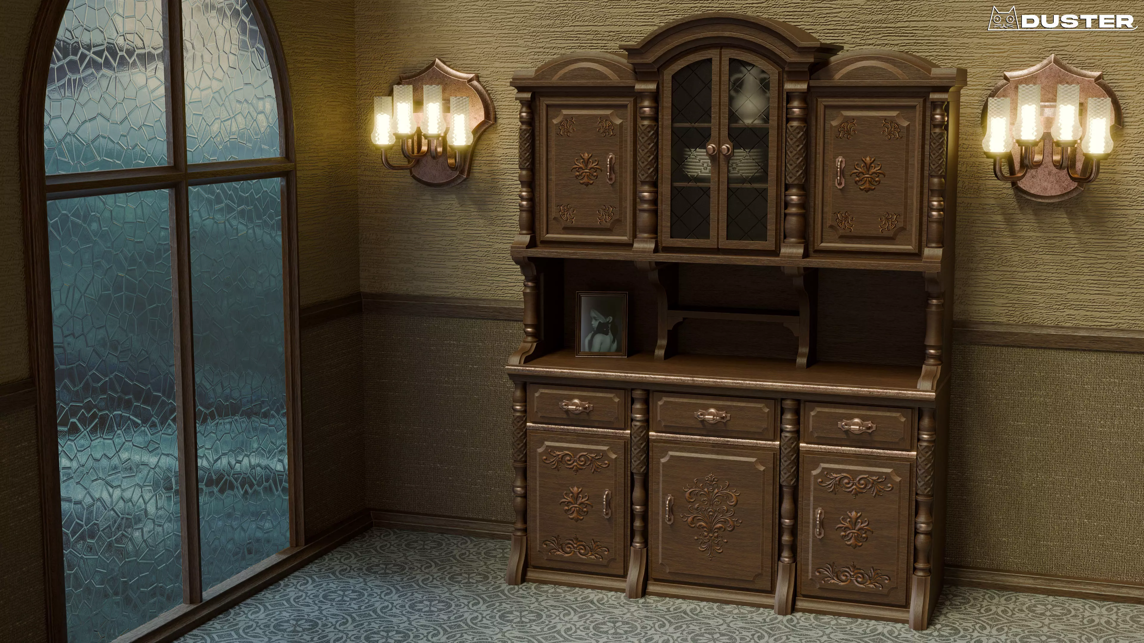This package contains the cupboard and the plates/jug inside.This model is also available in a bundle of vintage furniture which also includes the environment and decorations - available here: https://www.cgtrader.com/3d-models/furniture/furniture-set/vintage-furniture-bundle-99cf2501-7af6-42f0-9deb-3a9538576d70