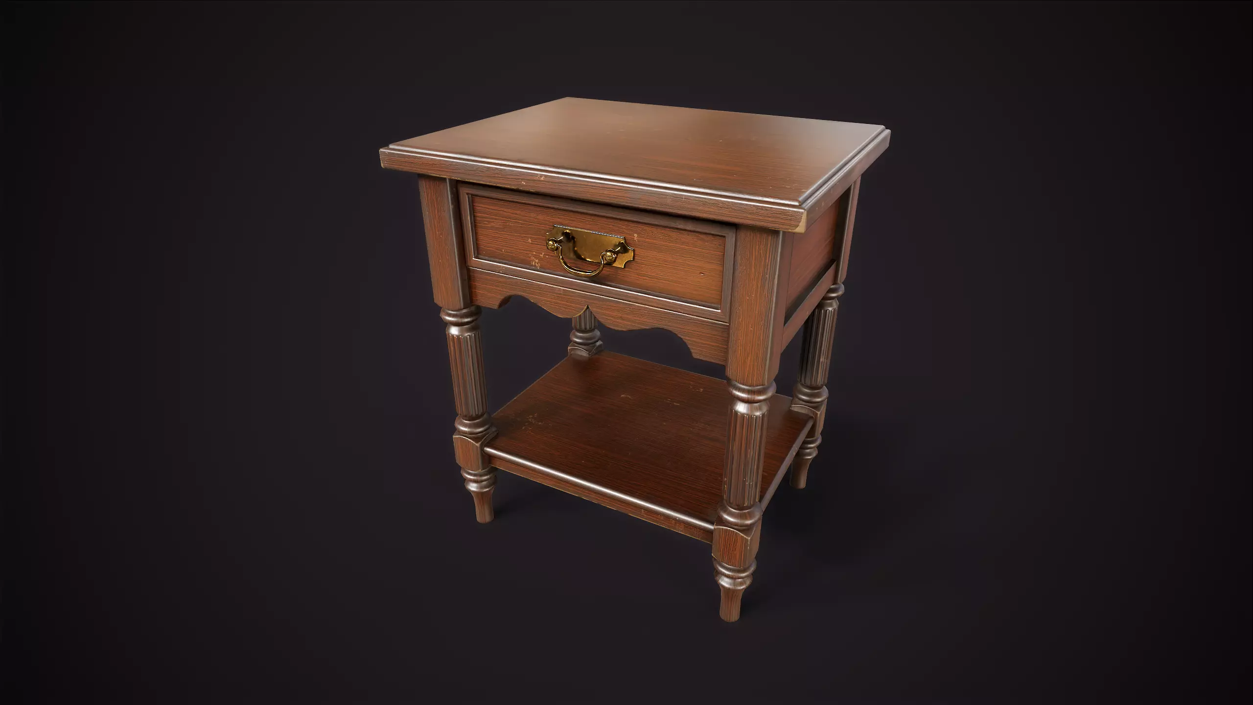 Vintage nightstand with turned legs and a drawer that can be opened.