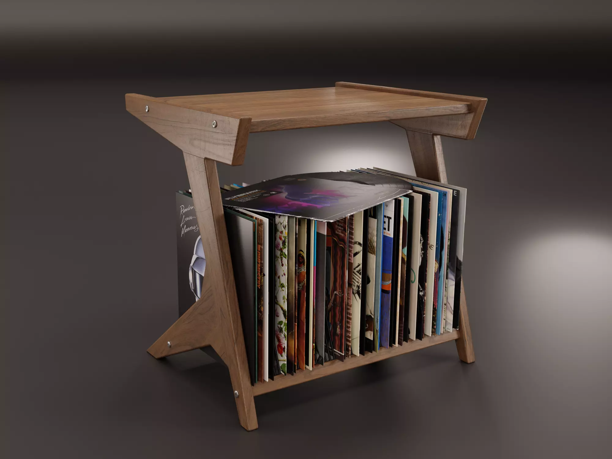 Realistic 3D model of a vinyl LP storage with hundreds of vinyls. The model is suitable for any visual production - broadcast, advertising, design visualization, etc