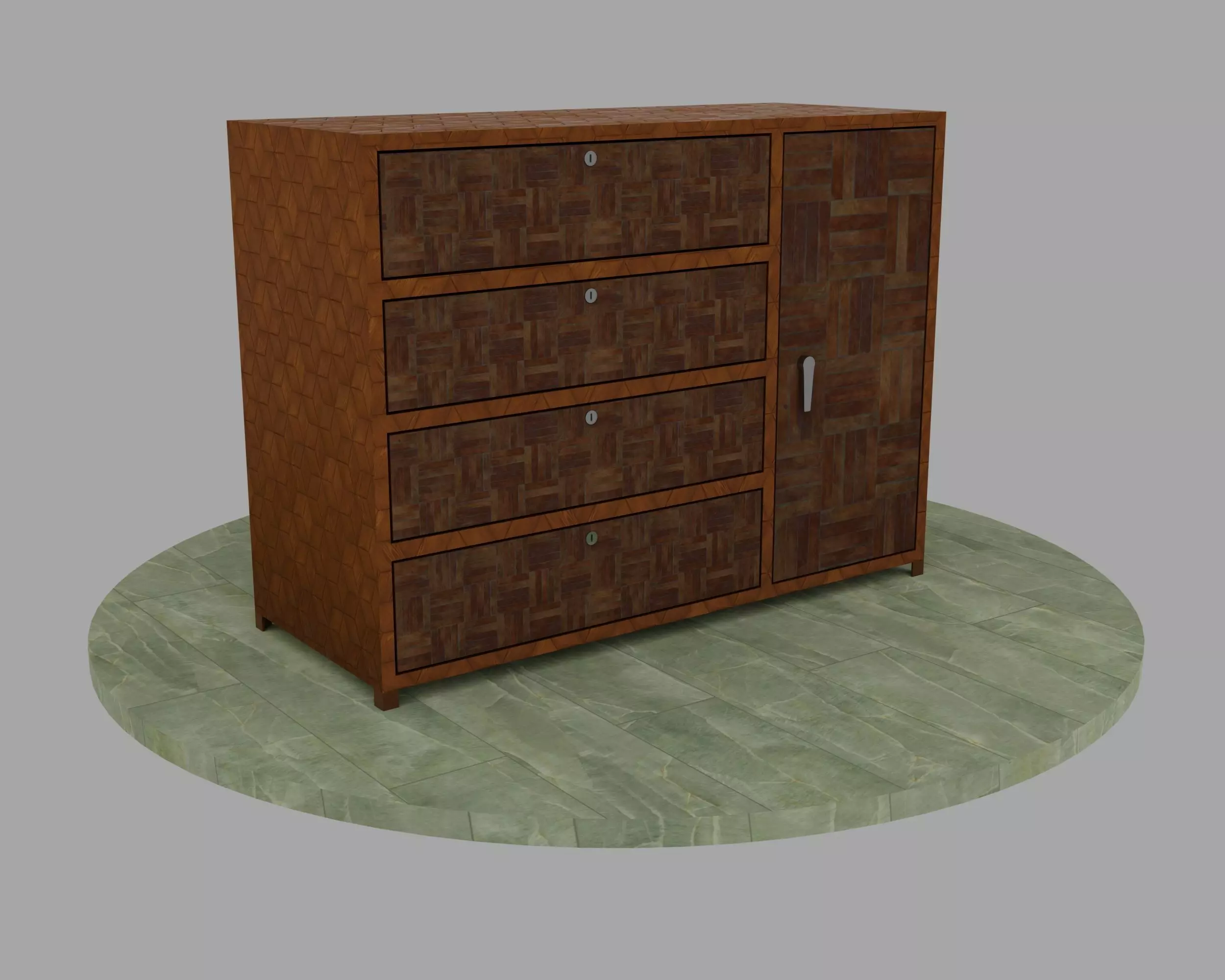 Low poly Wooden Wardrobe with Openable Door and Drawers. Door has rotateable handle.
