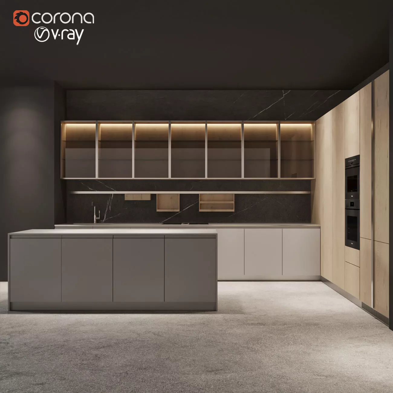 GAMMA GLASS WALL UNITSA welcoming kitchen, both functional and for socialising. The work area with hob and sink and the snack peninsula with footrest in steel, have doors in gray Fenix NTM with integrated grooved handle in steel finish, 2 cm thick worktop and accessorised back panel in matte Mercury quartz. The wall units, with 96 cm tall doors in wired Stopsol glass and frame in steel finish, are lined with Fossil Oak and have built-in lighting, showcasing pots used every day while keeping them within easy reach. On the right, the storage area with doors in vertical grain Fossil Oak, WIC (Walk in Closet), tall unit with double oven and tall unit for fridge and freezer.