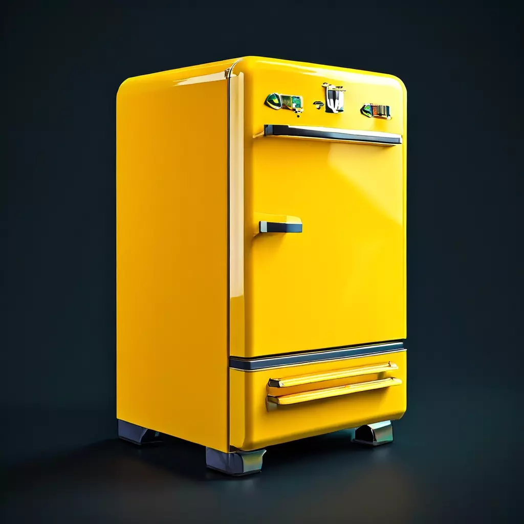 This vibrant 3D model showcases a retro-style yellow refrigerator, featuring rounded edges, metallic details, and a single-door layout with a bottom vent grill. Perfectly designed for use in stylized kitchens, vintage-themed scenes, or playful product visualizations, this model brings a bold splash of color and nostalgia to any 3D project.