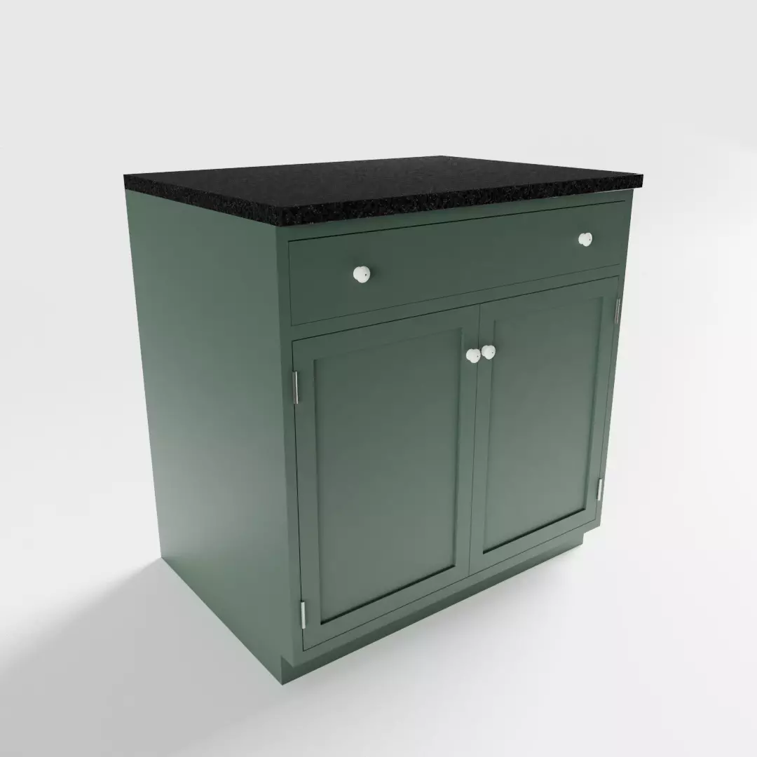 The model has real world scale and measures approximately 62 cm in depth, 84 cm in length and 88 cm in height. It consists of four seperate, but grouped and parented meshes: Green Cottage Kitchen Cabinet, Left-door, Right-door and Drawer. Exception: in the .ply-file they are joined together.
