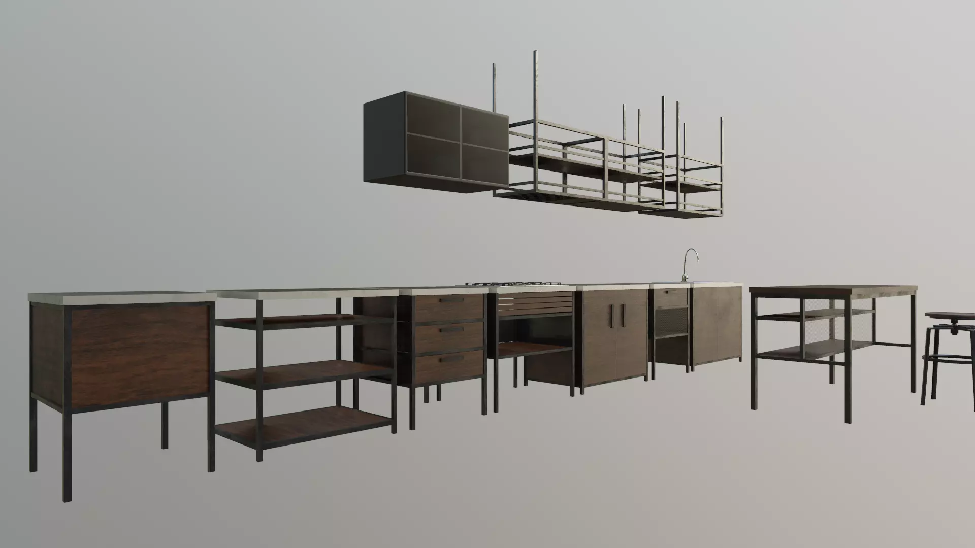 A set of furnishings for an Industrial/rustic style kitchen. Iron hardware, wood and steel worktops.