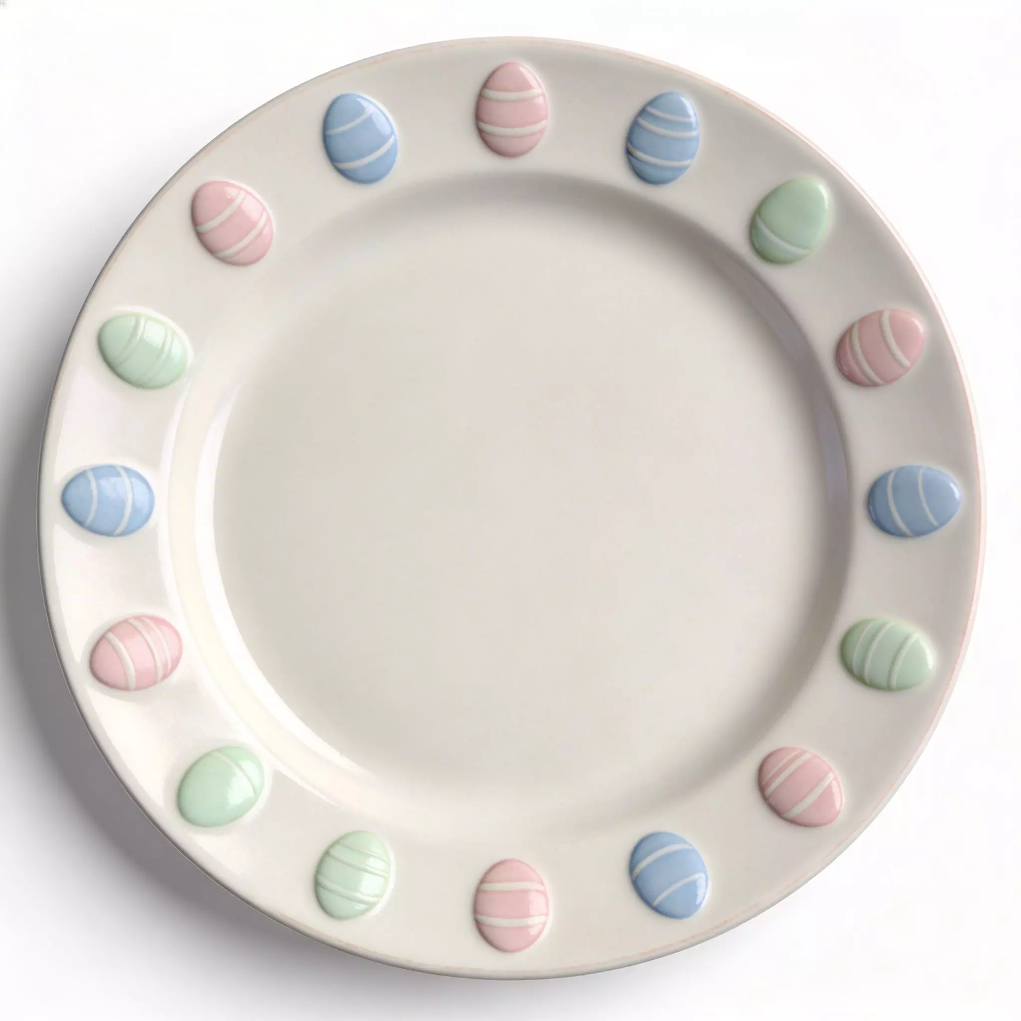 The wide rim is decorated with 14 evenly spaced, 3D-sculpted Easter egg motifs in a repeating sequence of pastel pink, light blue, and mint green.