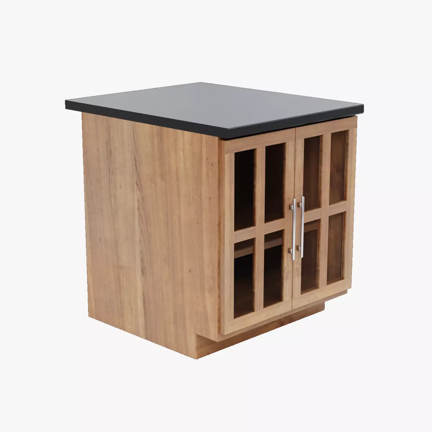 Modern kitchen island counter with working cabinets. Counter top edges are flat to the sides of the counter to allow easy combination with other counters.