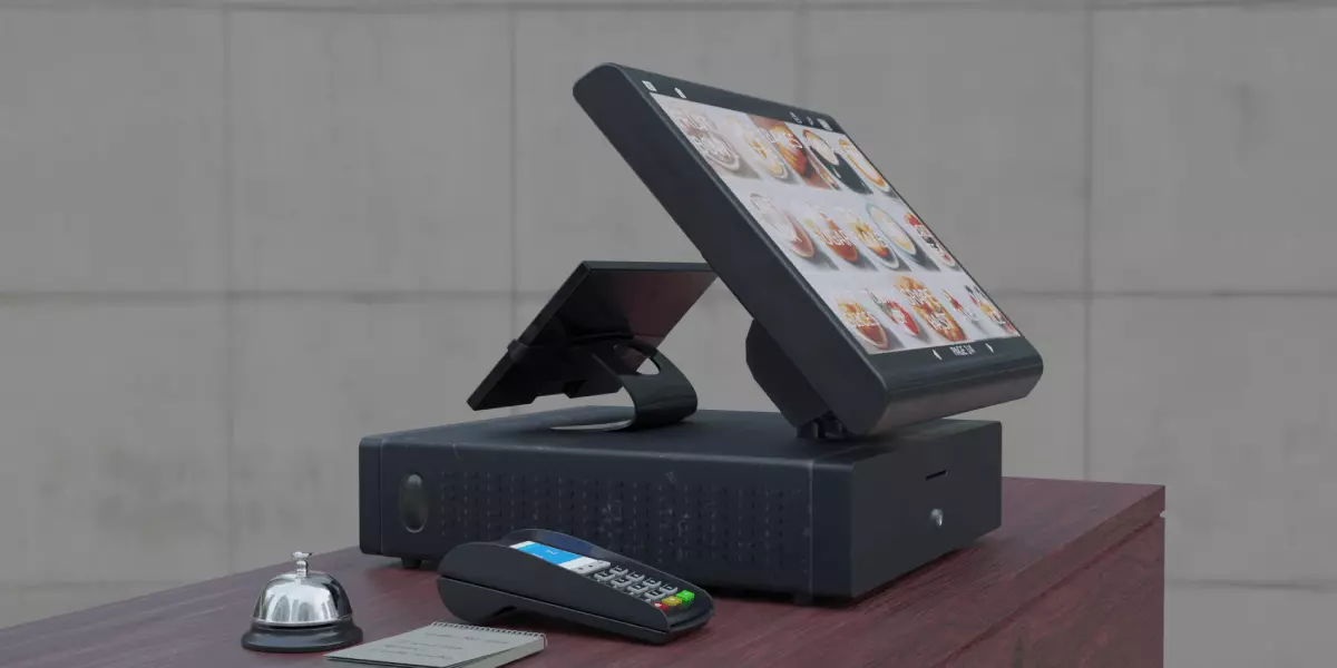 The 3D model depicts a stationary order taker machine commonly found on countertops in cafes and coffee shops. This device is operated by the cafe staff and is used to enter customer orders into the system.