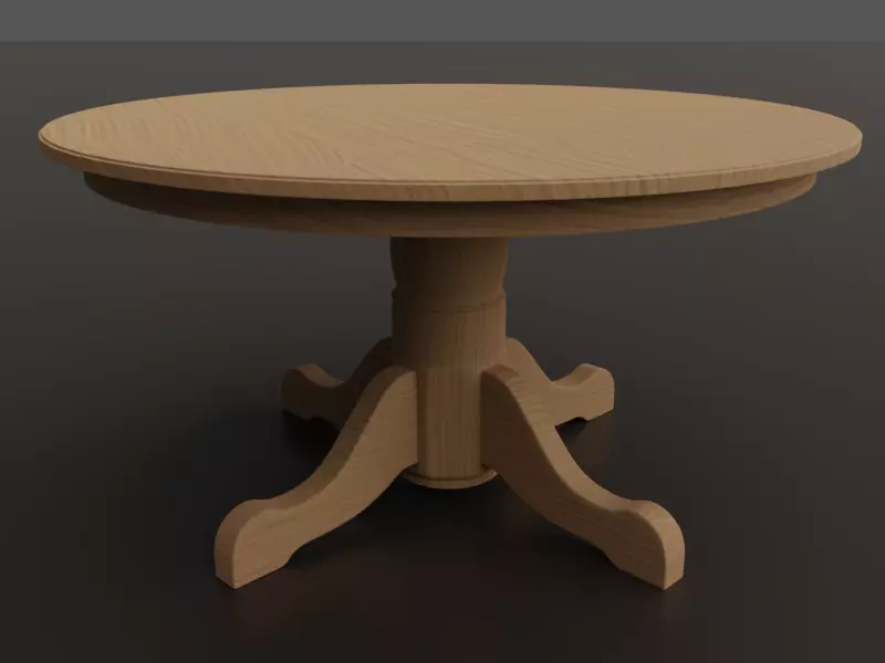 A round wooden table. Drawn to scale in Blender. The renders shown here were created in BlenderThe Blender UVs do not overlap. The overall dimensions are: 46.75x 46.75 x 25". This is a low poly model ready for subdivision. There are 6924 faces (all quads) and 7095 vertices.