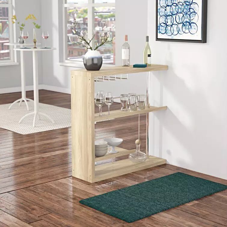 • Crafted from select solid woods and wood products with a stylish metal post and stemware holders, this sleek bar cabinet features a contemporary finish. Sleek top surface to show off your drink creations and delectable snacks.