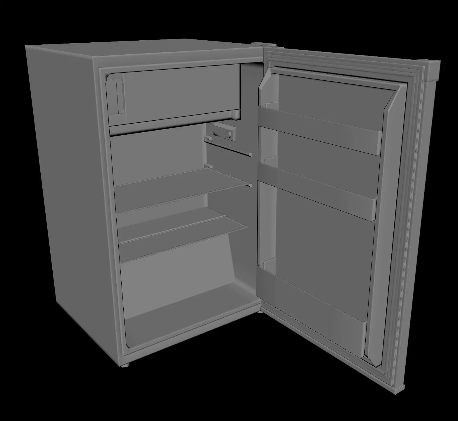 Detailed small fridge asset with approximately 7,000 polygons, designed for high-quality real-time scenes or close-up props. Interior included, so it can be rigged. The model features clean topology and well-defined shapes, including door separation, handle, and subtle panel details. UVs are organized using a UDIM workflow, allowing high-resolution texturing across multiple tiles for greater detail and flexibility. No shading or baked lighting is included, making it easy to apply custom materials in your engine or renderer. Suitable for realistic or semi-realistic interior environments.