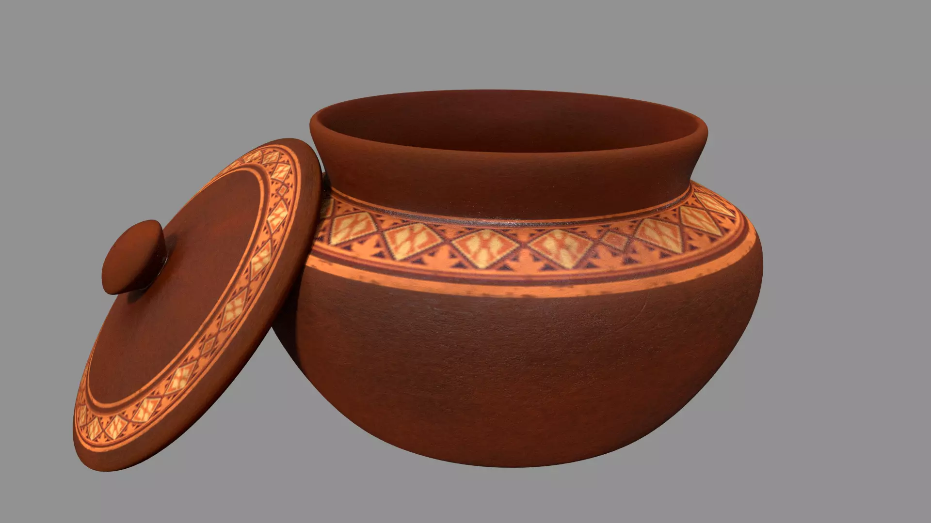 Asset Name : VesselA (Prop)Simple stylized Decorated Pot (Crock) with cap having handpainted patterned design on it.