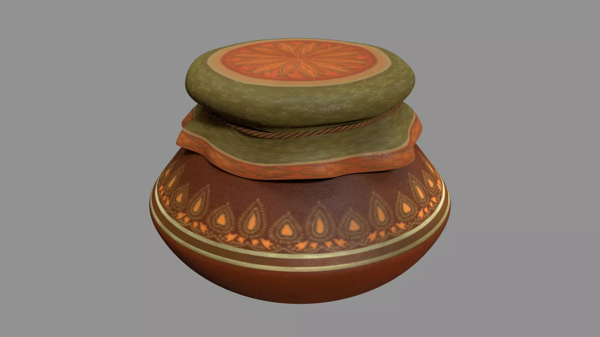 Asset Name : VesselB (Prop Stylized)Simple stylized Decorated Pot (Crock) tied with cloth and rope.