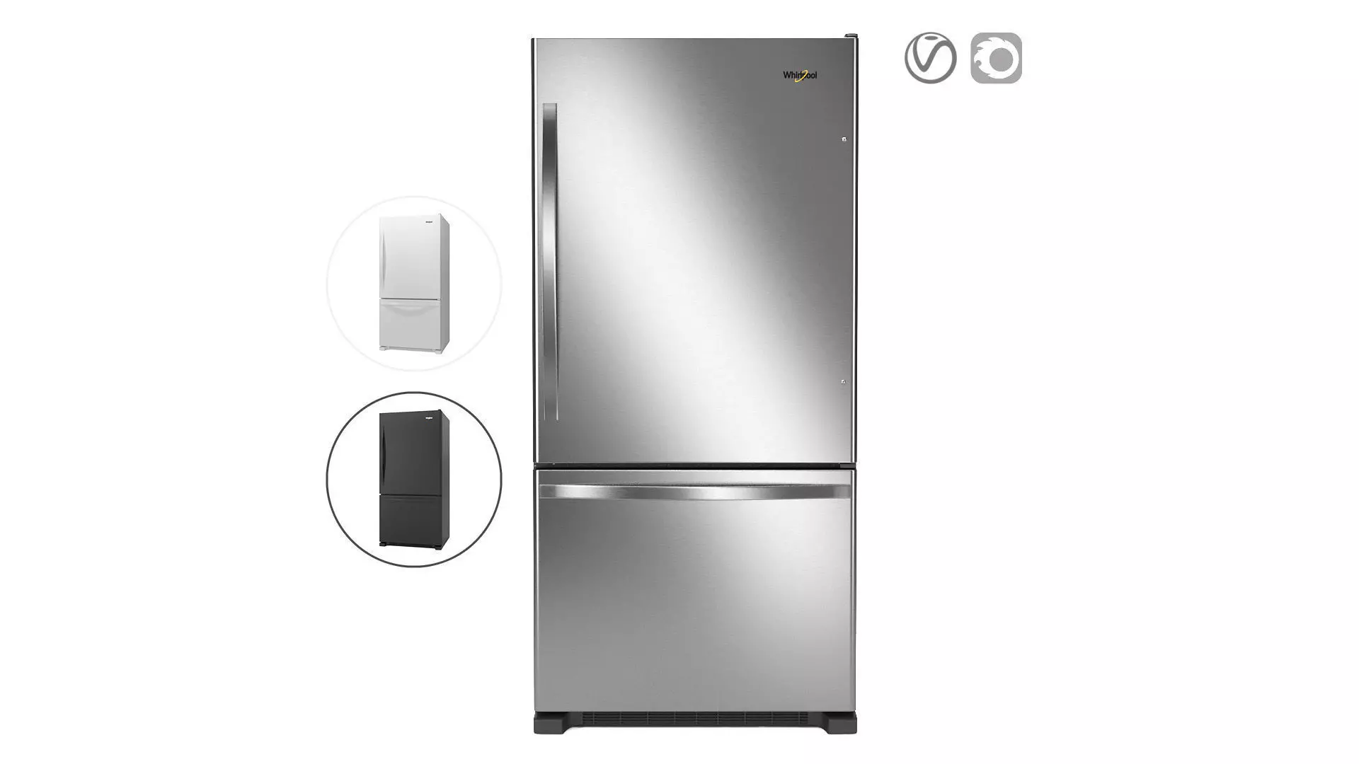33-inches wide Bottom-Freezer Refrigerator with SpillGuard ™ Glass Shelves - 22 cu. ftIn the .max file 3 materials for different colors of models:WRB322DMBB- blackWRB322DMBW- whiteWRB322DMBM- steel