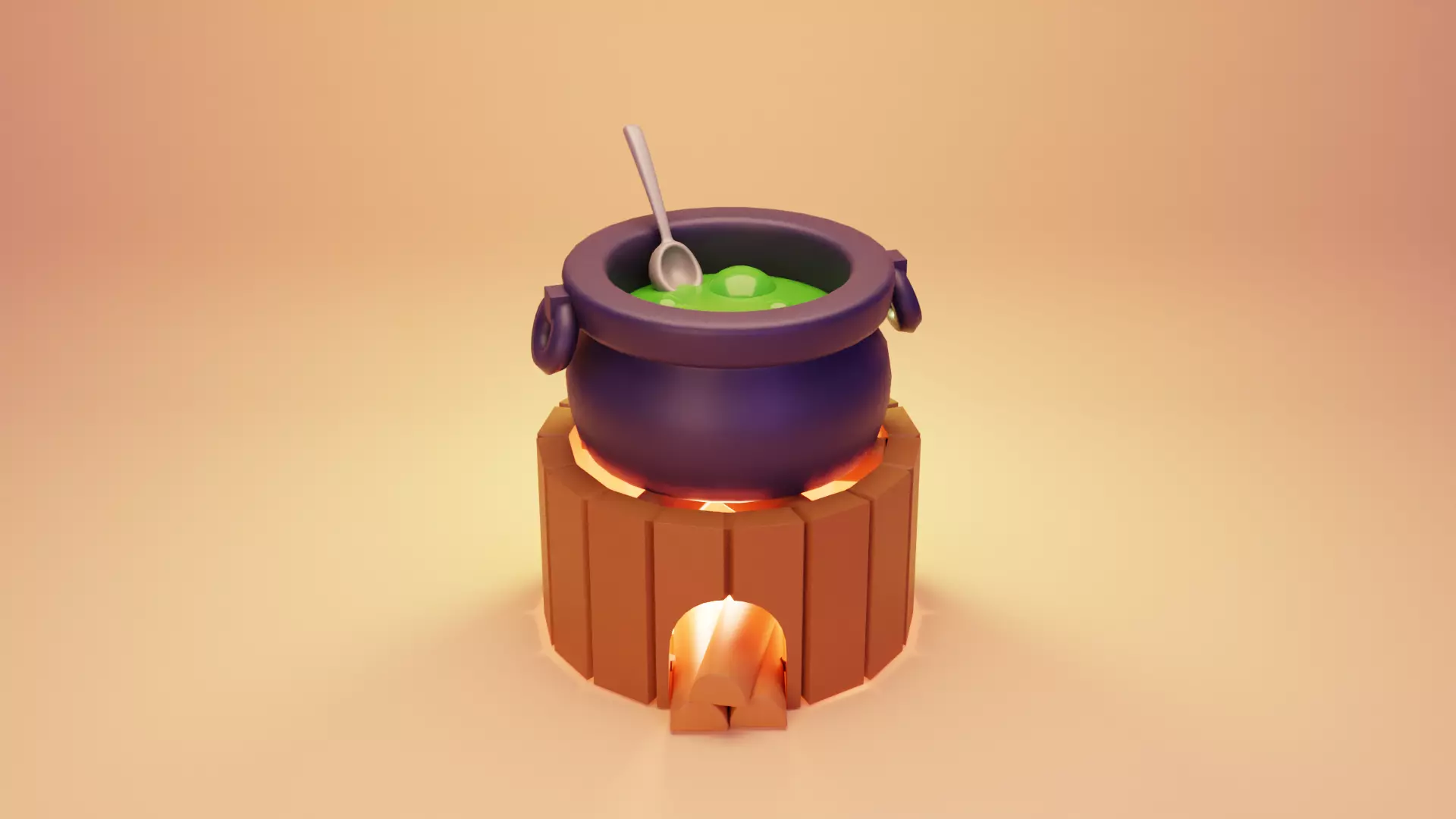 Witch Cauldron with Camp Fire ans Spoon Low-poly 3D model