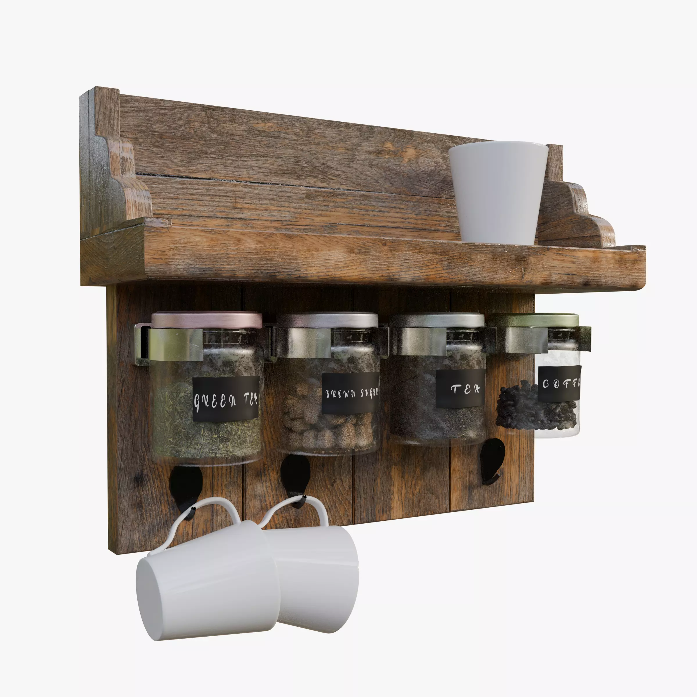 • Rustic wooden wall shelf designed as a stylish and functional kitchen organizer.