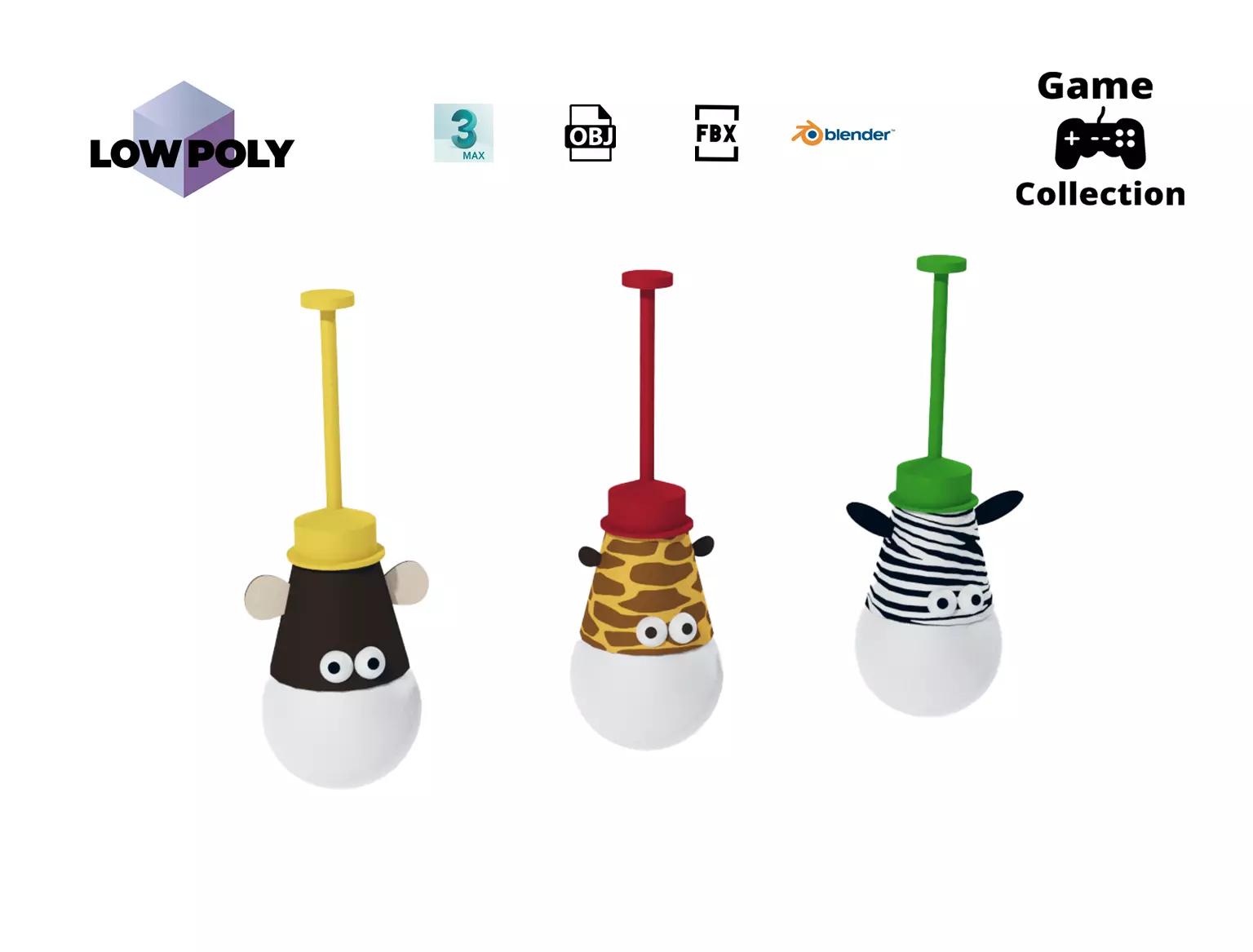 Set of 3 different animal lamps really suitable for children decoration scenes. The poly count of each model is between 1200 and 1500 polys. So, they are low poly and ready for 3D scenes or games. They have been created in different 3D Studio Max versions , Blender and also in FBX and OBJ. All the models have their pivot point correctly positioned to be comfortably used in game engines like Unity or Unreal.