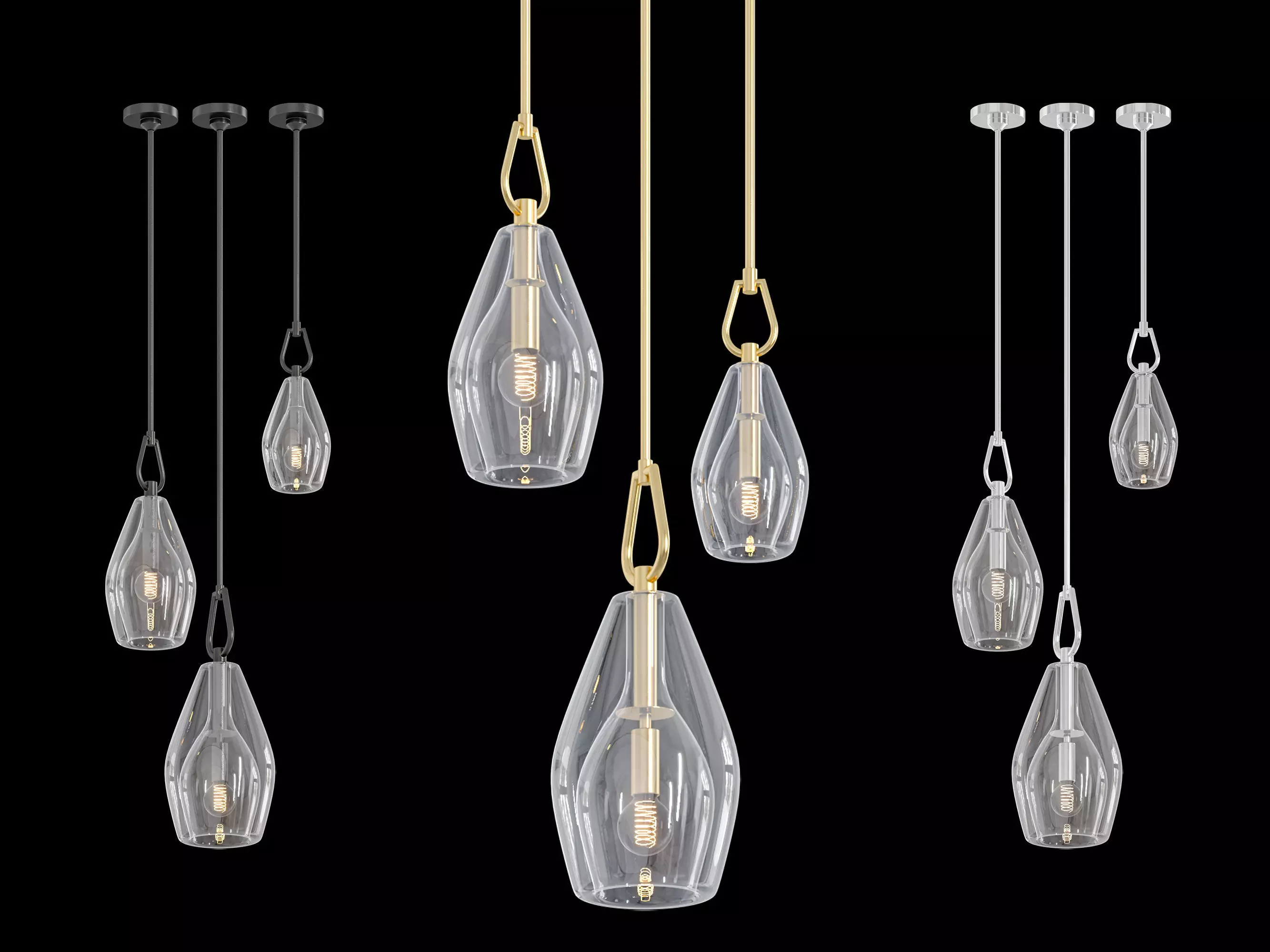 in 3 different materials: black, gold, and silver