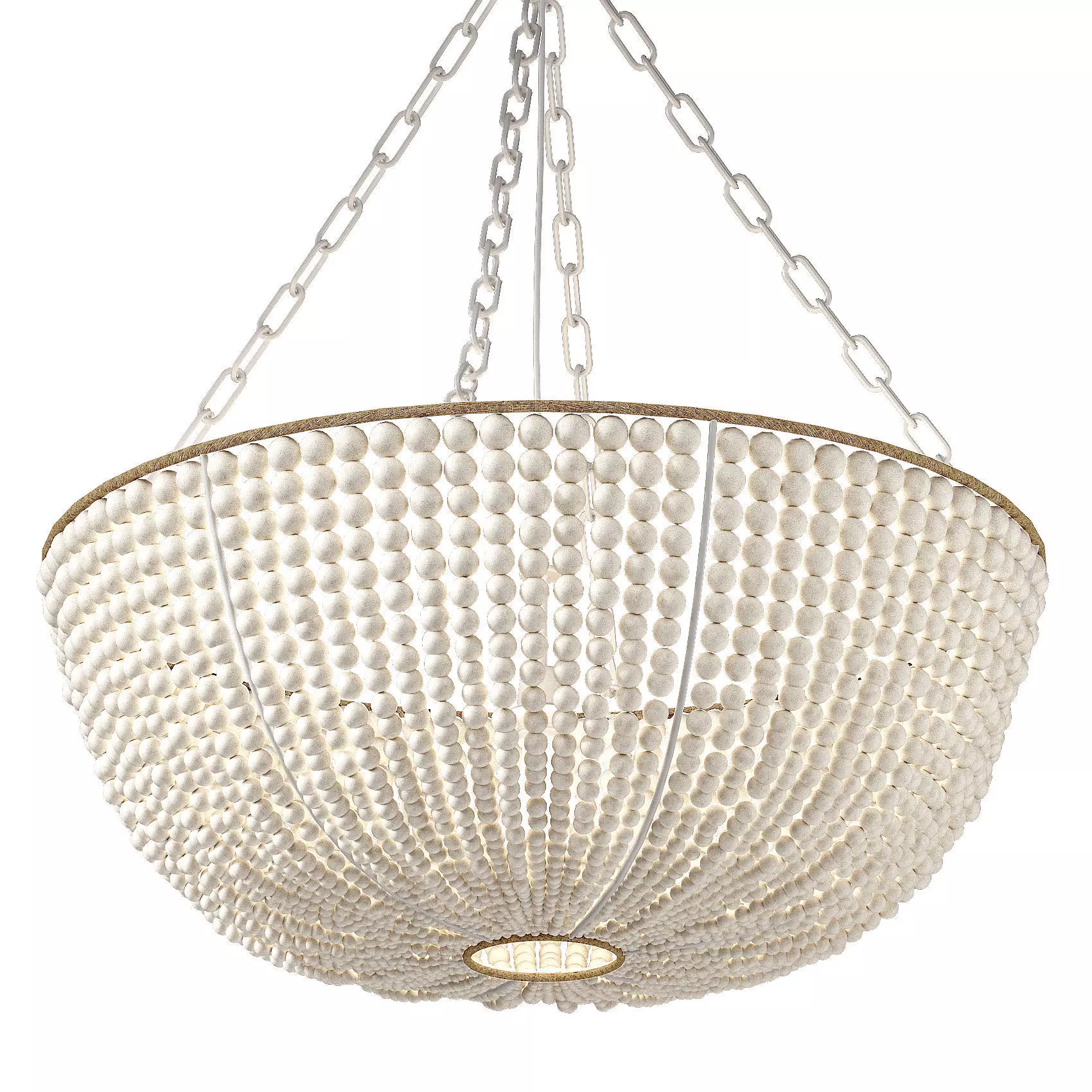 The chandelier is decorated with hundreds of handmade wooden beads, each of them individual. Handmade wooden beads on a white powder coated iron frame. Adjustable height chain.