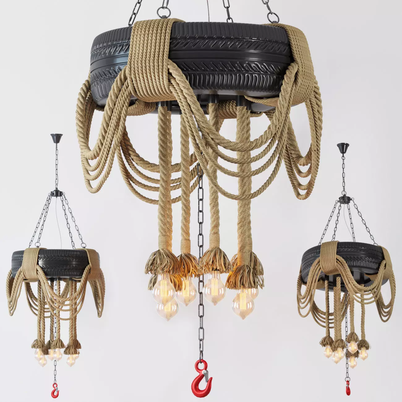 descriptionChandelier GommaA chandelier made of an automobile wheel, decorated with a rope, with six lamps descending on the ropes.The original Techno design of the Gomma chandelier is so unusual that it is impossible to look away from it. A massive car wheel braided with a rope and a rope, looks stylish and creative. Suspended construction, hold securely three metal chains. Design in the style of minimalism is ideal for the interior of the workshop, modern office, wooden house, villa.CHARACTERISTICSType ChandelierMaterial Metal, RopeDiameter 80 cm, height 100 cmLamp type 6 x E27 x 40 W x 220 VStyle Loft / Industrial /Place of usebar, cafe, restaurant / living room / hotel and hotel / kitchen / dining / lounge / show room, studio /In the archive: Max 2011_Vray