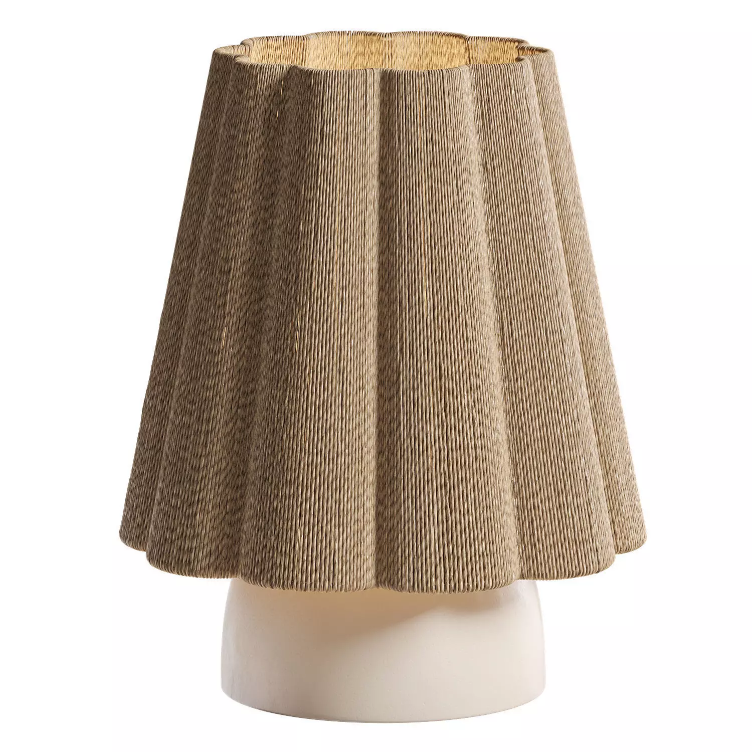A small table lamp.The glazed stoneware half-sphere and jute twine-covered shade are inspired by the artistic aesthetics of the French Riviera of the 1940s and 1950s.
