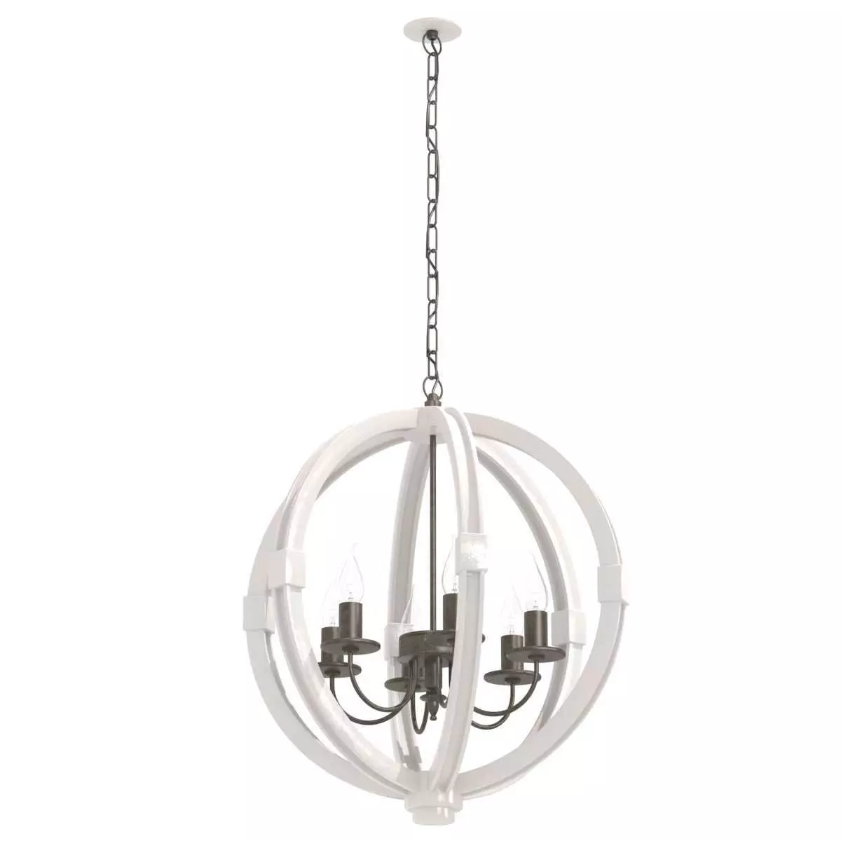 Custom made globe chandelier 6 lightcandle lamps, pendant, chain, metal, curved arms,white, beige, dark brown, antique paint, vintage, retro, country,