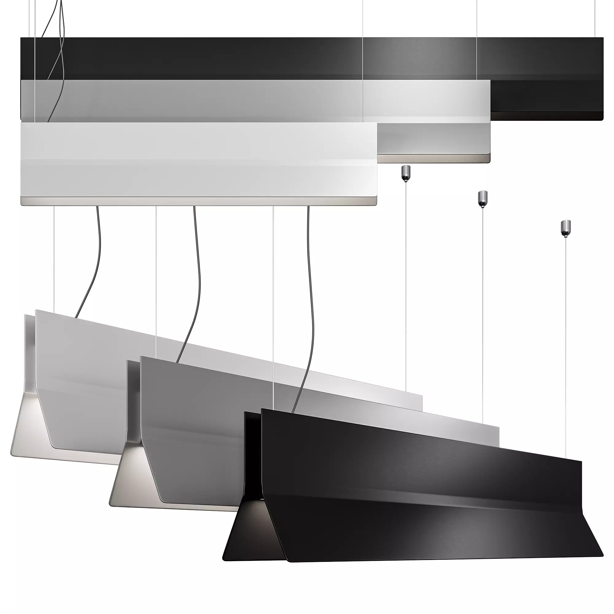 Narrow-profile pendant luminaire with protruding diffuser creating a parallelepiped of continuous scattered light. Ideal for direct lighting that provides the user with pleasant ambient illumination both in individual modules and in continuous line systems with diffused light.