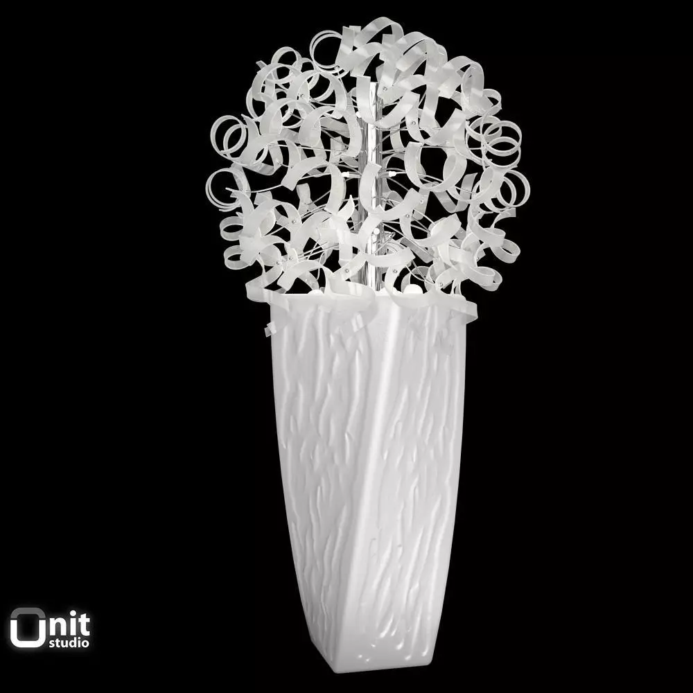 Floor light Astro by MetalLux with 42 glass curls and polished metal structure, planted in a decorated white ceramic vase filled with pebbles.Diameter 60cmHeight 110cm