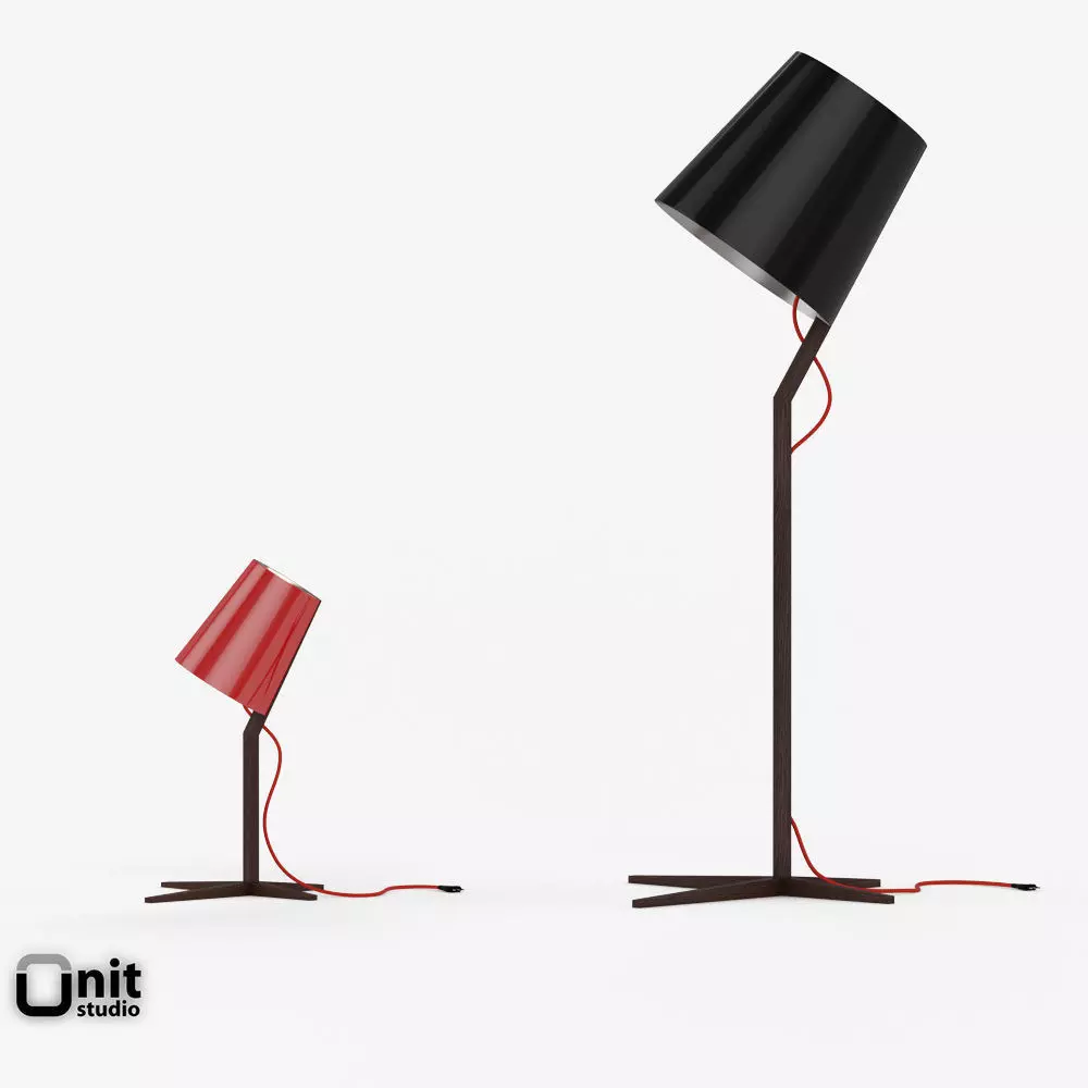 A fun new light angle from designer Sean Dare. Solid white oak post slants the view askew topped by tapered white shade. Off-center perspective is grounded in asymmetrical X base of intersecting focal points. Unexpected red cloth cord pops the light bright.
