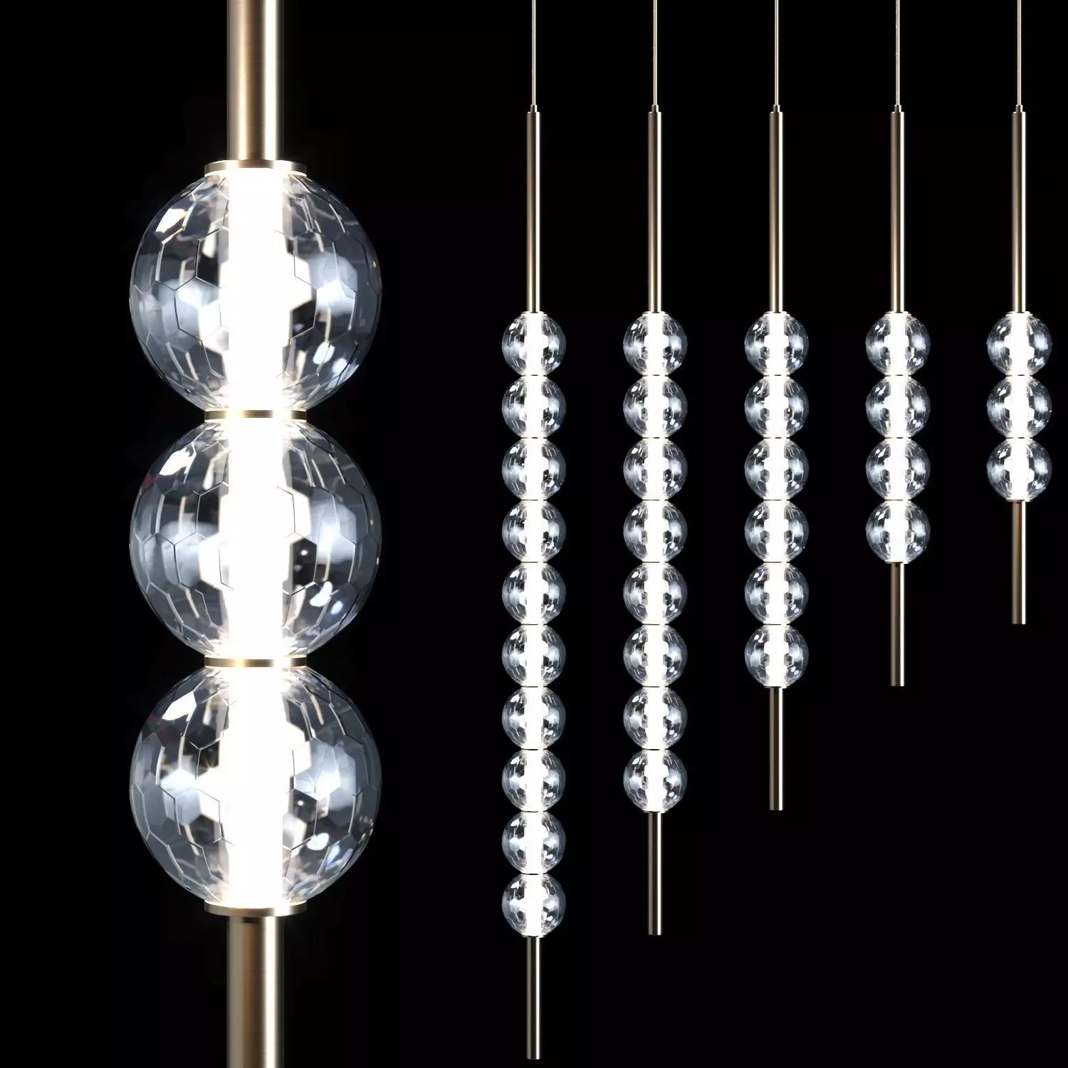 A series of LED luminaires with multifaceted spherical crystal shades on a tubular frame.