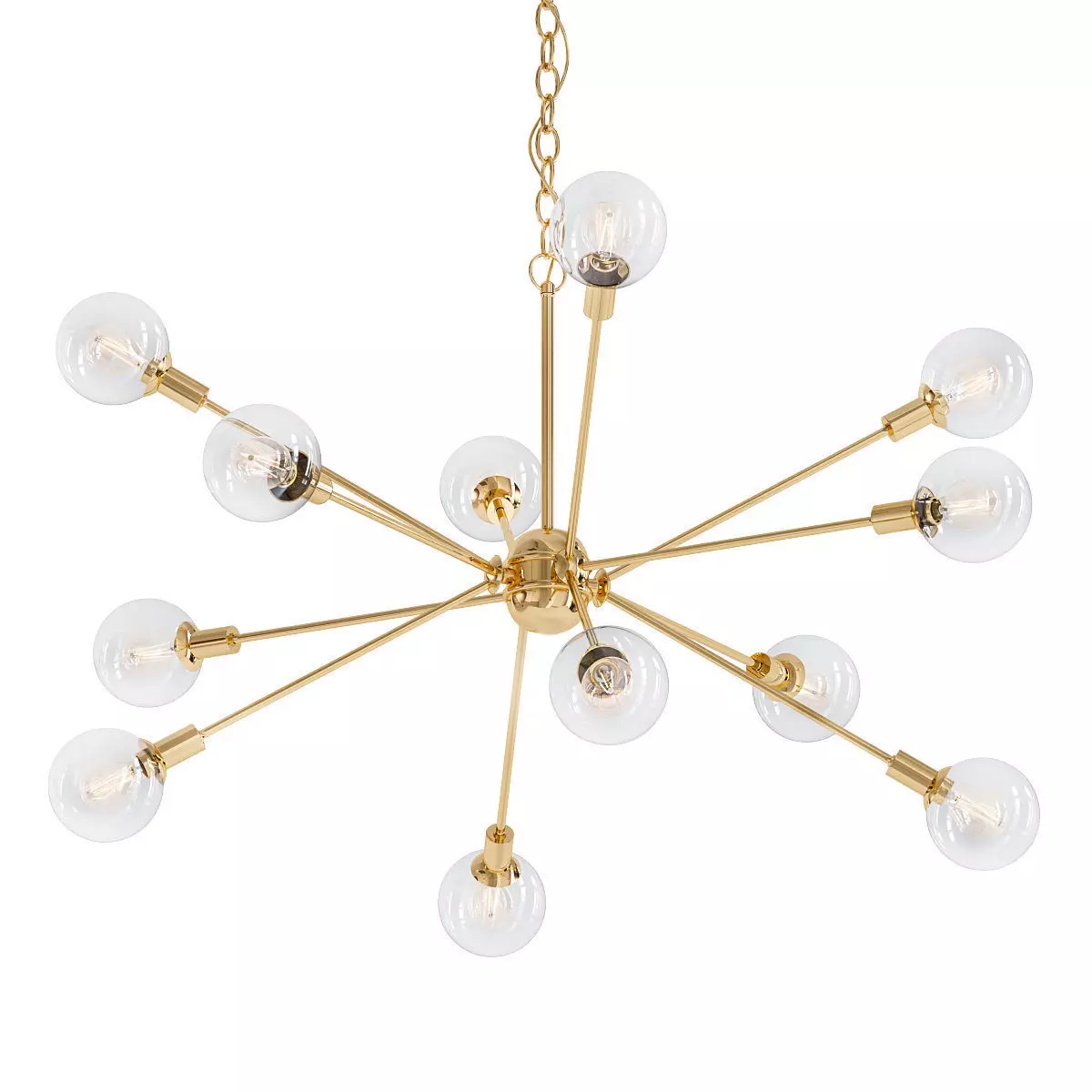 DescriptionTwelve arms in clusters of three radiate from a slightly oblong body in this dramatic chandelier. The globe glass shades are double layered, with a clear outer globe surrounding a smaller frosted inner globe. They lend a futuristic orbit effect, bringing to mind galactic star bursts and radiating constellations.Actual Size: 25.5Hx43.75Wx43.75DBackplate/Canopy Size: 5W RoundBulb Base: G9Bulb Included: NoChain Length: 60Color: GoldCord/Wire Length: 84Limited Warranty: 1 YearMaterial: Glass, MetalMax Bulb Wattage: 40Number of Lights: 12Overall Height Max: 87Overall Height Min: 29Safety Rating: DryWeight: 14