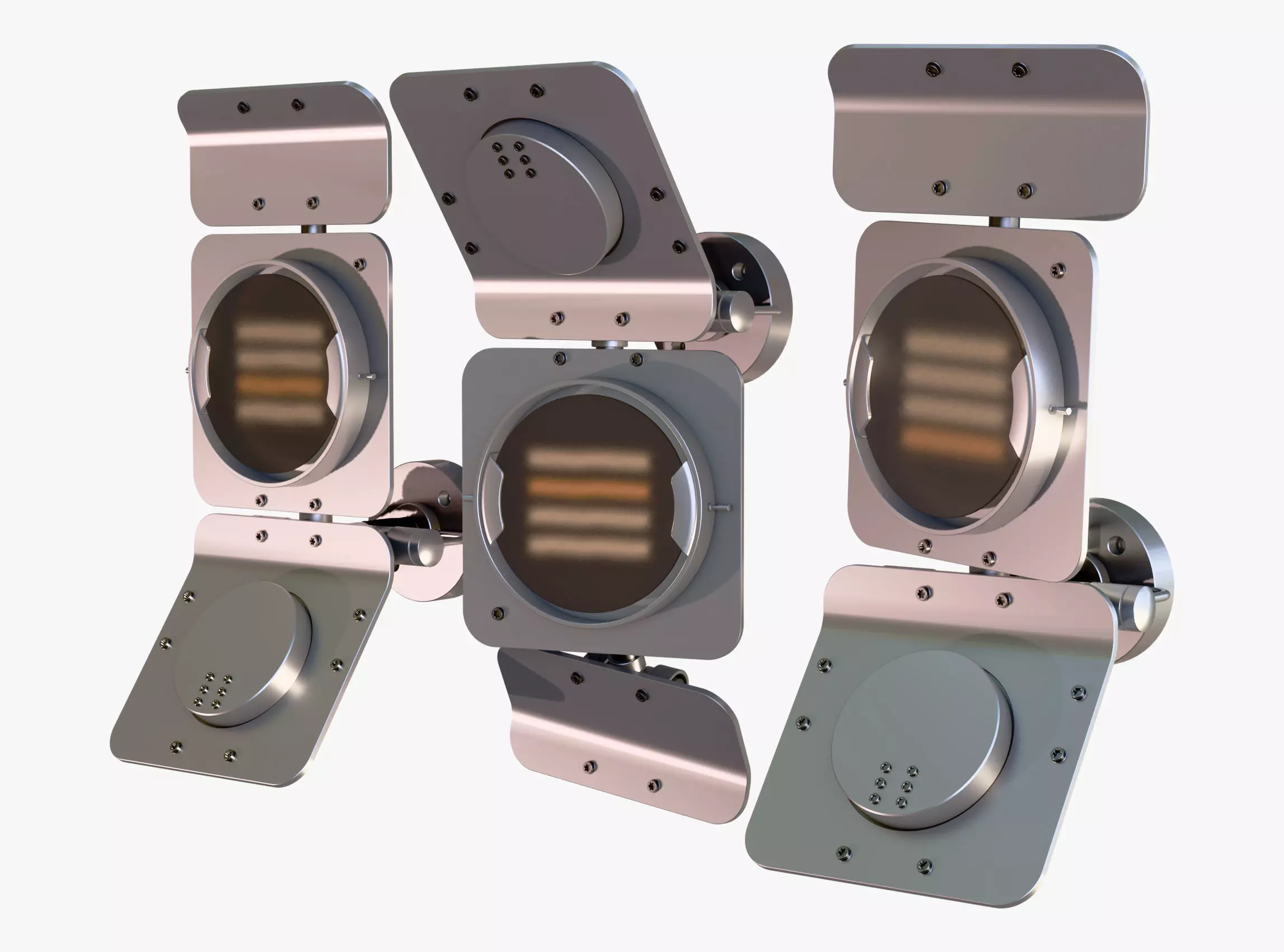 Industrial-style wall-mounted studio floodlights. The matte metal body features a square faceplate housing a circular light with horizontal filament. The design includes adjustable barn doors and a robust swivel hinge mount.