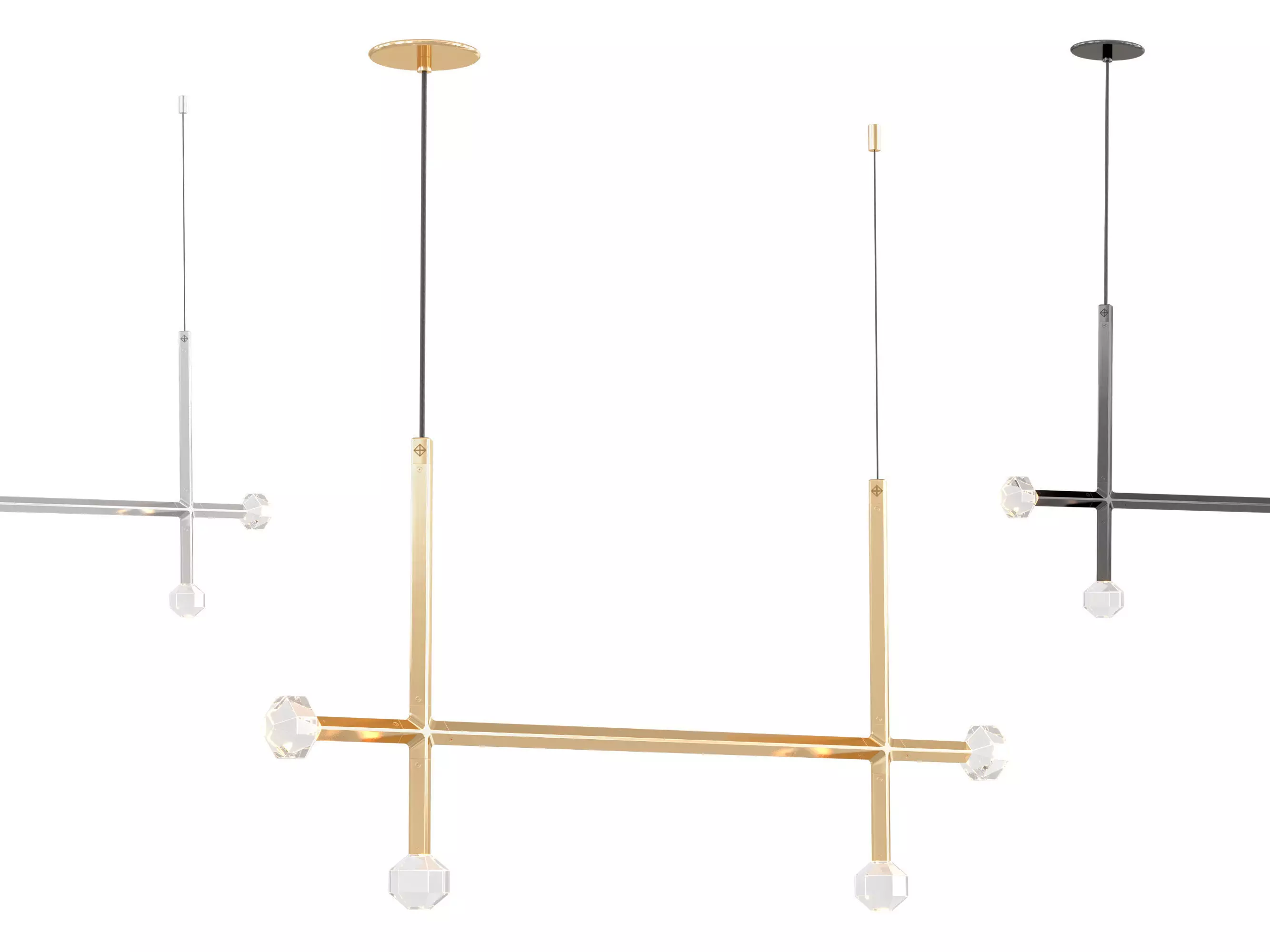 Joulle reimagines the classic crystal chandelier as a network of un-mined earthen stones. A quiet bevel traces both ore and light, contouring the machined aluminum body and the hand-polished cut crystal light source. The resulting form is reminiscent of the gems historically found at the bottom of chandelier silhouettes… and within fabled troves. Comprised of modular elements that quickly lock together, Joulle becomes a never-ending network of sculptural ceiling and wall fixtures.
