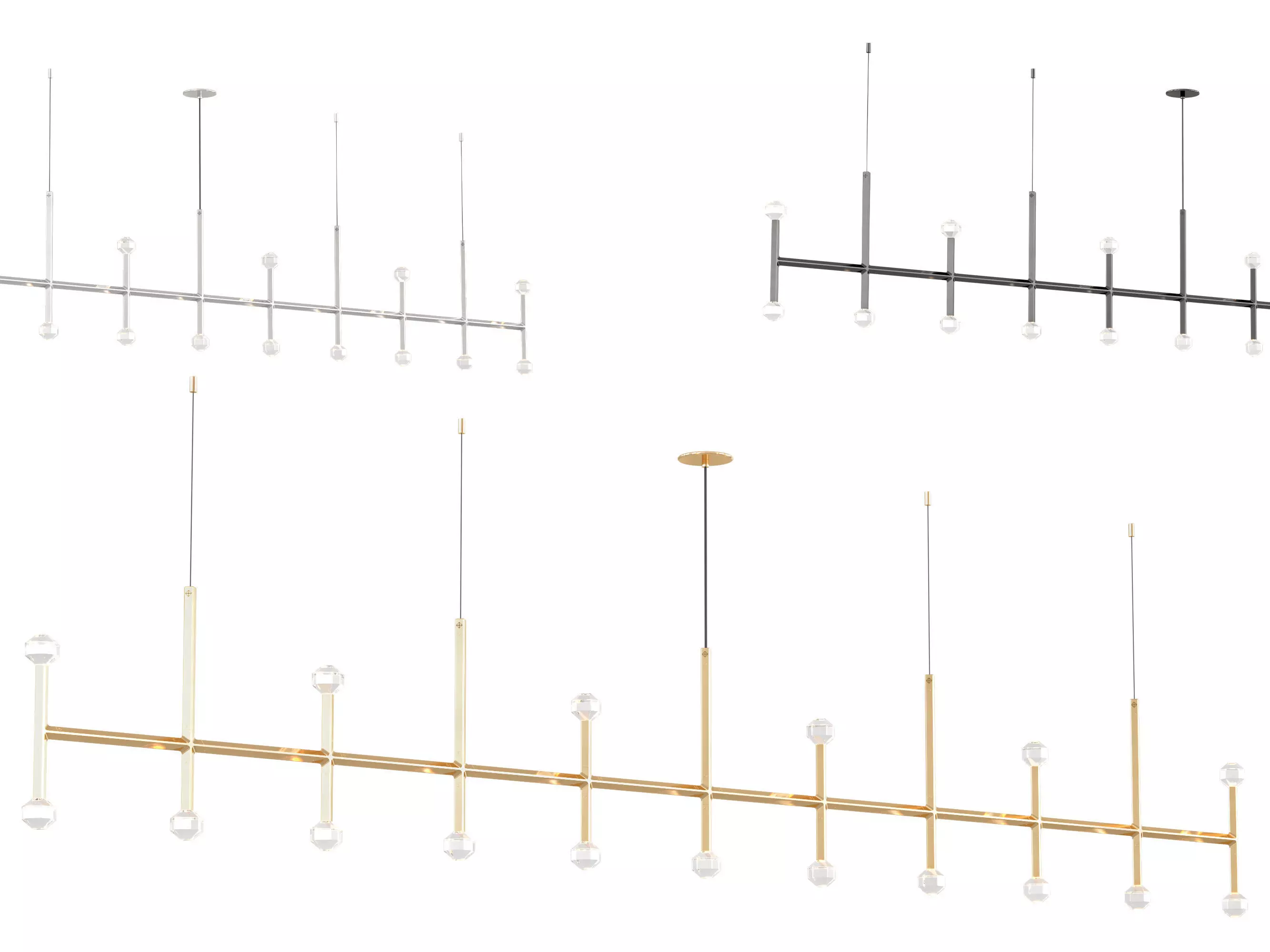 Joulle reimagines the classic crystal chandelier as a network of un-mined earthen stones. A quiet bevel traces both ore and light, contouring the machined aluminum body and the hand-polished cut crystal light source. The resulting form is reminiscent of the gems historically found at the bottom of chandelier silhouettes… and within fabled troves. Comprised of modular elements that quickly lock together, Joulle becomes a never-ending network of sculptural ceiling and wall fixtures.