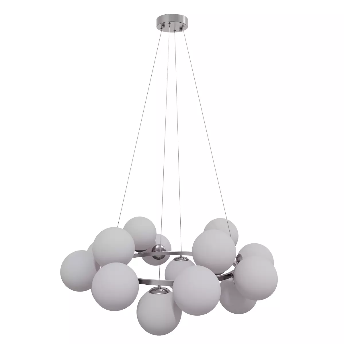 The chandelier is suitable for placement in the living room, in a cafe, in the bedroom, in the kitchen, in the office, in the hall, in a modern style. The material of manufacture is metal, nickel color. The model has 16 lampshades (glass). Dimensions: height - 110 cm, diameter - 83 cm, fastening on a mounting plate.