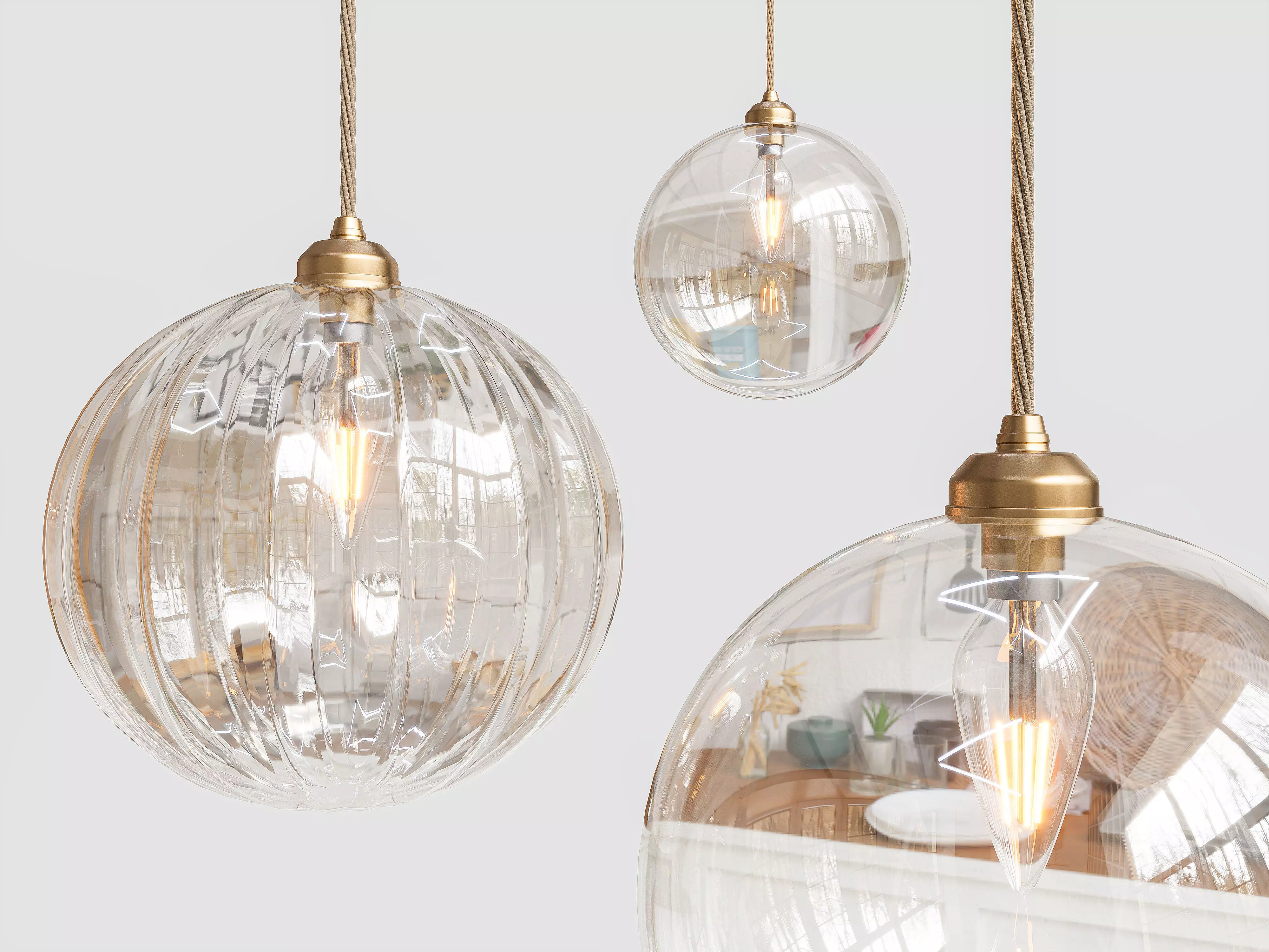 These elegant glass pendant lights combine timeless craftsmanship with contemporary charm. Each fixture features a beautifully shaped clear glass shade, showcasing subtle variations in form—from softly ribbed globes to smooth rounded silhouettes. The transparent glass allows the warm glow of the exposed filament bulb to shine through, creating a cozy, ambient illumination.