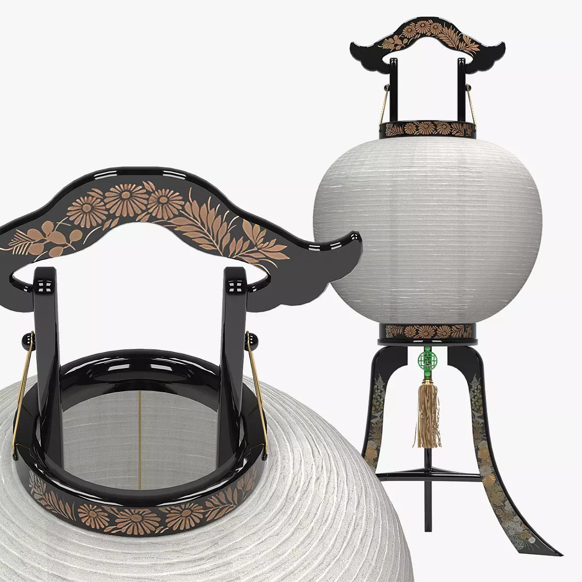 Paper Ouchi lantern, on a three-legged wooden stand. It is a lantern that is the center of the decoration in front of the Buddhist altar, and may have a family crest.
