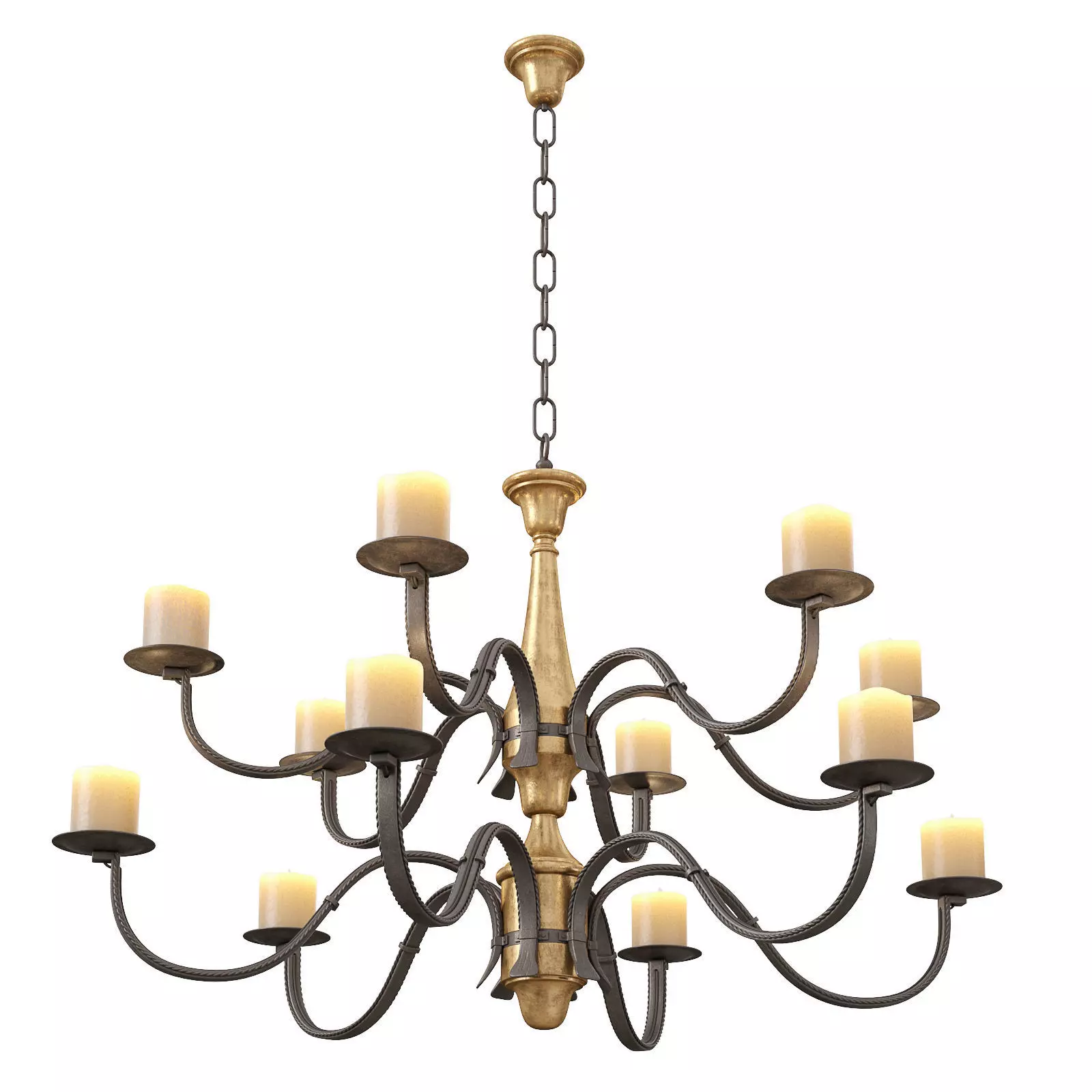 A two-tiered massive 12 light chandelier with wrought iron scrolled arms with twist edges and wax pillar candles. A fine gilt two part turned wood standard in an antiqued finish with iron mounts and chain. Very fine deep Amber glow when lit The model is assembled for subdivision.When using import formats, please apply MeshSmoth/TurboSmoth with 2-3 iterations.https://www.1stdibs.com/furniture/lighting/chandeliers-pendant-lights/paul-ferrante-rustic-style-chandelier-clinton-pillar-candles/id-f_27609182/Dimensions: Height: 35 in (88.9 cm)Diameter: 59 in (149.86 cm)