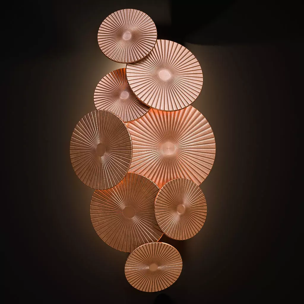 50k polyshttps://portaromana.com/product/nova-wall-light/ FEATURESPart of the Nova family, this exquisite wall light is generous in scale and precious in appearance. Like jewellery for the walls, the curved profile of angled discs catch the natural light at different angles and exudes a feeling of pure luxury.DETAILSHEIGHT540mm / 21 1/4WIDTH280mm / 11MIN PROJECTION160mm / 6 1/4MAX PROJECTION160mm / 6 1/4BACKPLATE DIMENSIONS405mm (16) X 115mm (4 1/2)