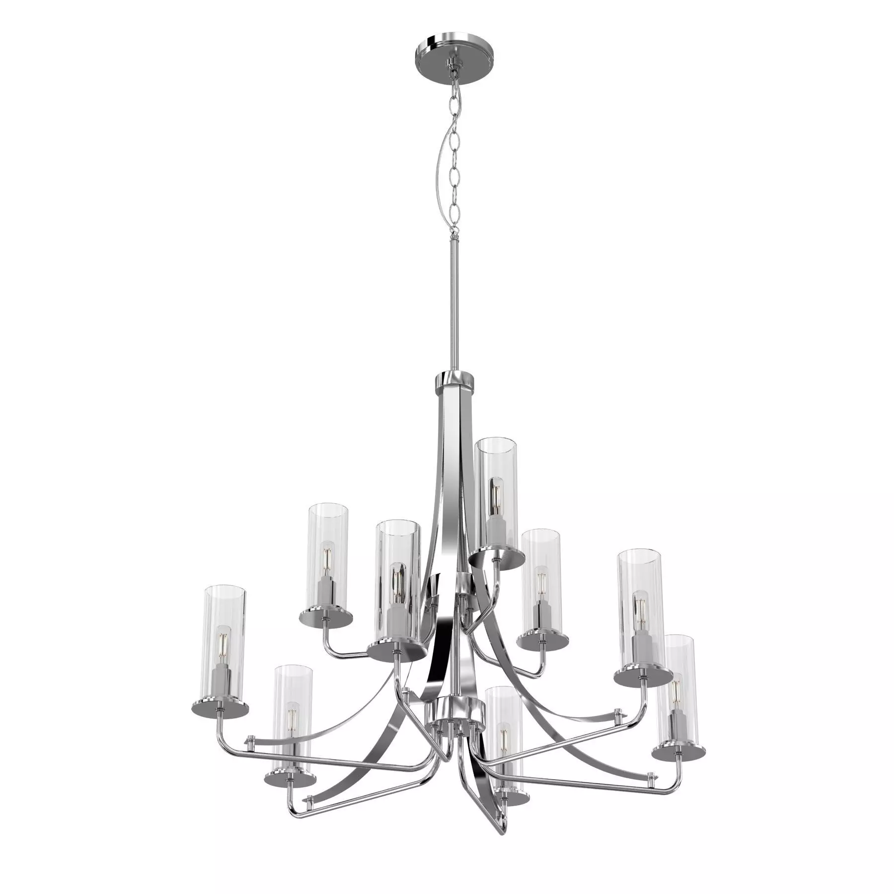 Clear glass shades are ready to offer stunning, rejuvenating illumination.The shades rest on a gorgeous brushed nickel frame with polished chrome accents that manifests feelings of tranquility and serenity.Incorporate a sleek simplicity and natural beauty with this chandelier.Ideal for any dining room, kitchen, or foyer.Perfect for new traditional or contemporary settings.Measures 30-inch width by 25-1/8-inch height.Uses nine candelabra base bulbs that are sold separately (60w max - LED or incandescent).Able to be fully dimmable with dimmable bulbs.