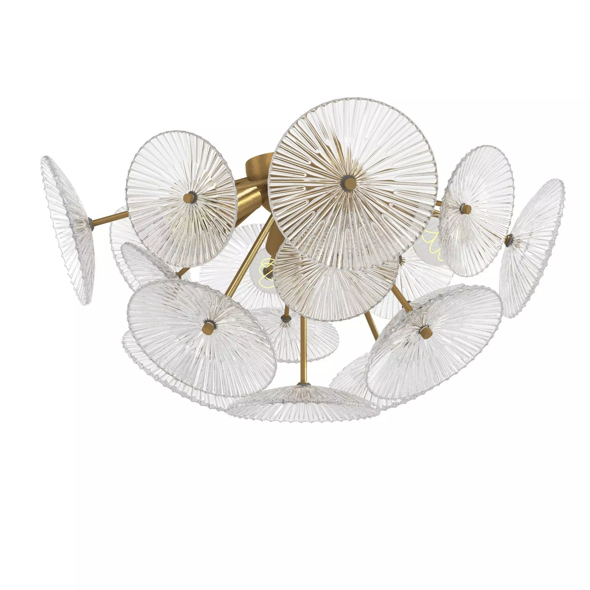 19 textured, smoked glass disks glow at the ends of brass-finished rodsIron canopy has a brass finishUses four 40W max E12 candelabra bulbsNot dimmer switch compatible110-120V manufactured to US standards for US and Canadian marketsCertified to Dry UL electrical standard: suitable for use indoors in dry locations not directly exposed to excessive moisture and waterHardwireRequires professional installation by a licensed electrician. RH delivery service does not include installationWipe with a soft, dry cloth; avoid the use of all cleaners and abrasivesDimensionsOverall: 20½diam., 10HCanopy: 5¼diam., 1HWeight: 11 lbs.