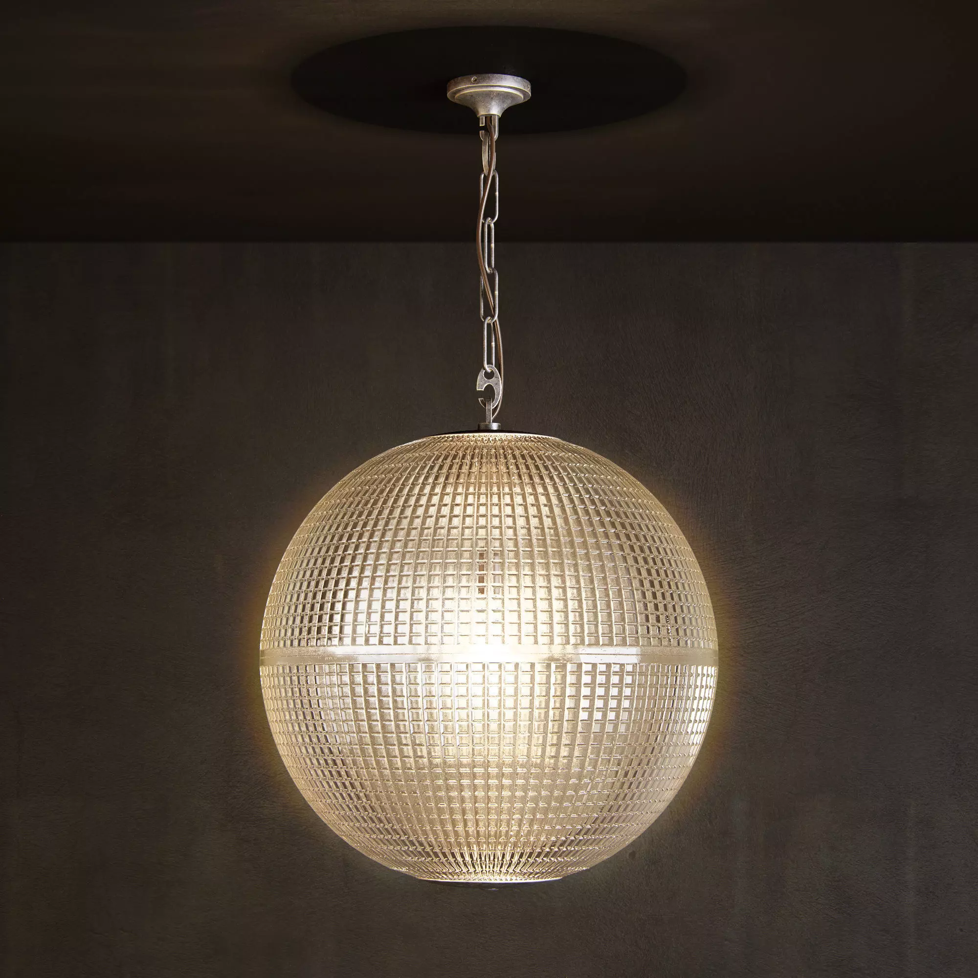 Spherical pendant offers an update on 1960s design. Based on a honeycomb-glass prototype from the period, it features a prismatic grid that intensifies and diffuses the light cast by a single bulb.