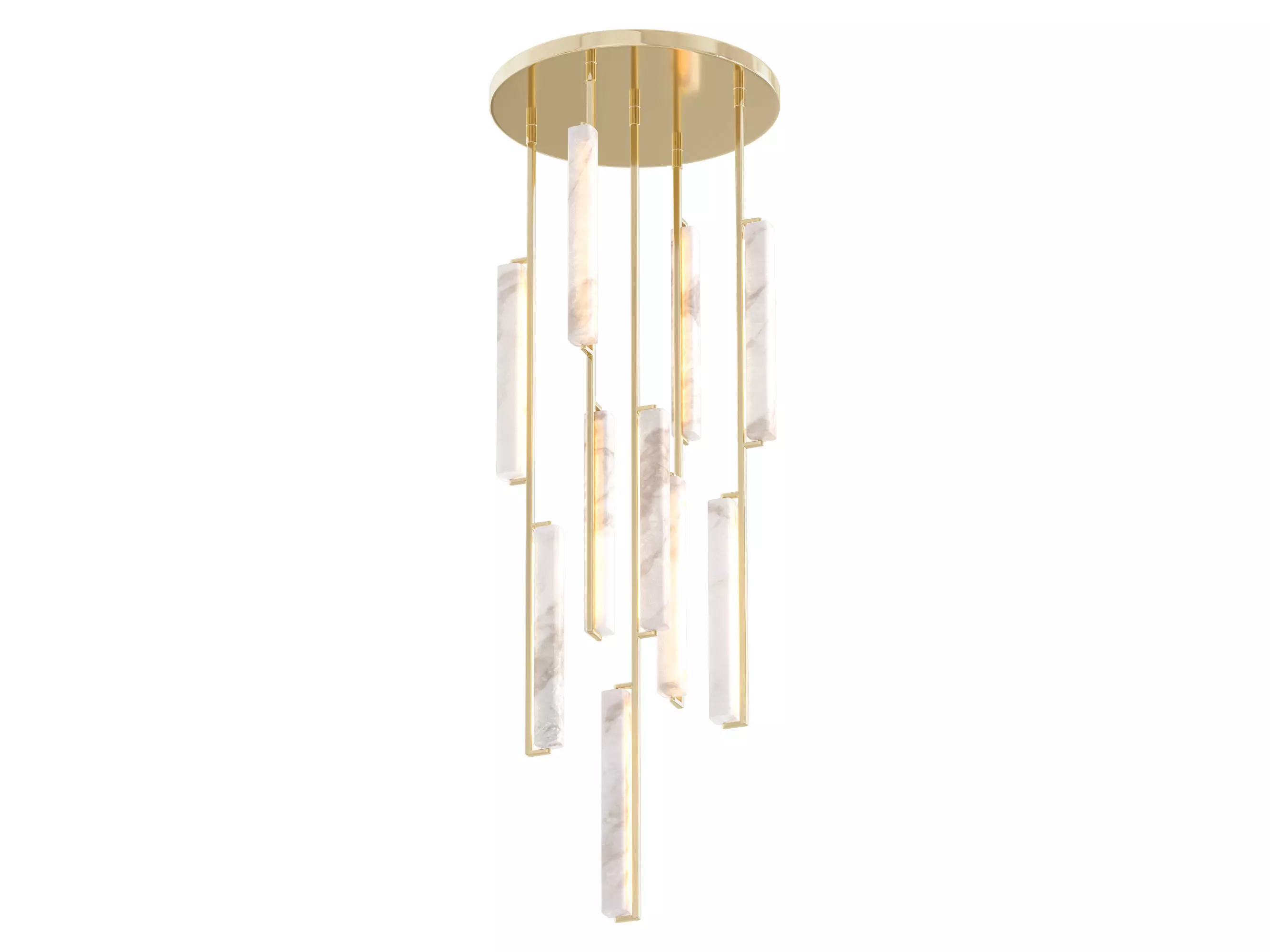 Capturing the spirit of 1960s Italian minimalism, Audubon appears to cascade from above with ten prisms of alabaster on vertical brass drops. At once striking and restrained, the collection by Joseph Jeup evokes the warmth of candlelight with elongated LEDs that shed beautiful light through the translucent stone.v