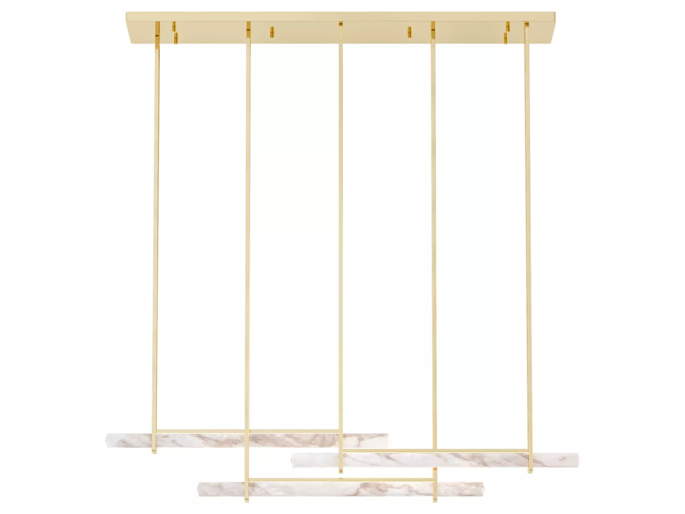 Capturing the spirit of 1960s Italian minimalism, Audubon appears to cascade from above with ten prisms of alabaster on vertical brass drops. At once striking and restrained, the collection by Joseph Jeup evokes the warmth of candlelight with elongated LEDs that shed beautiful light through the translucent stone.