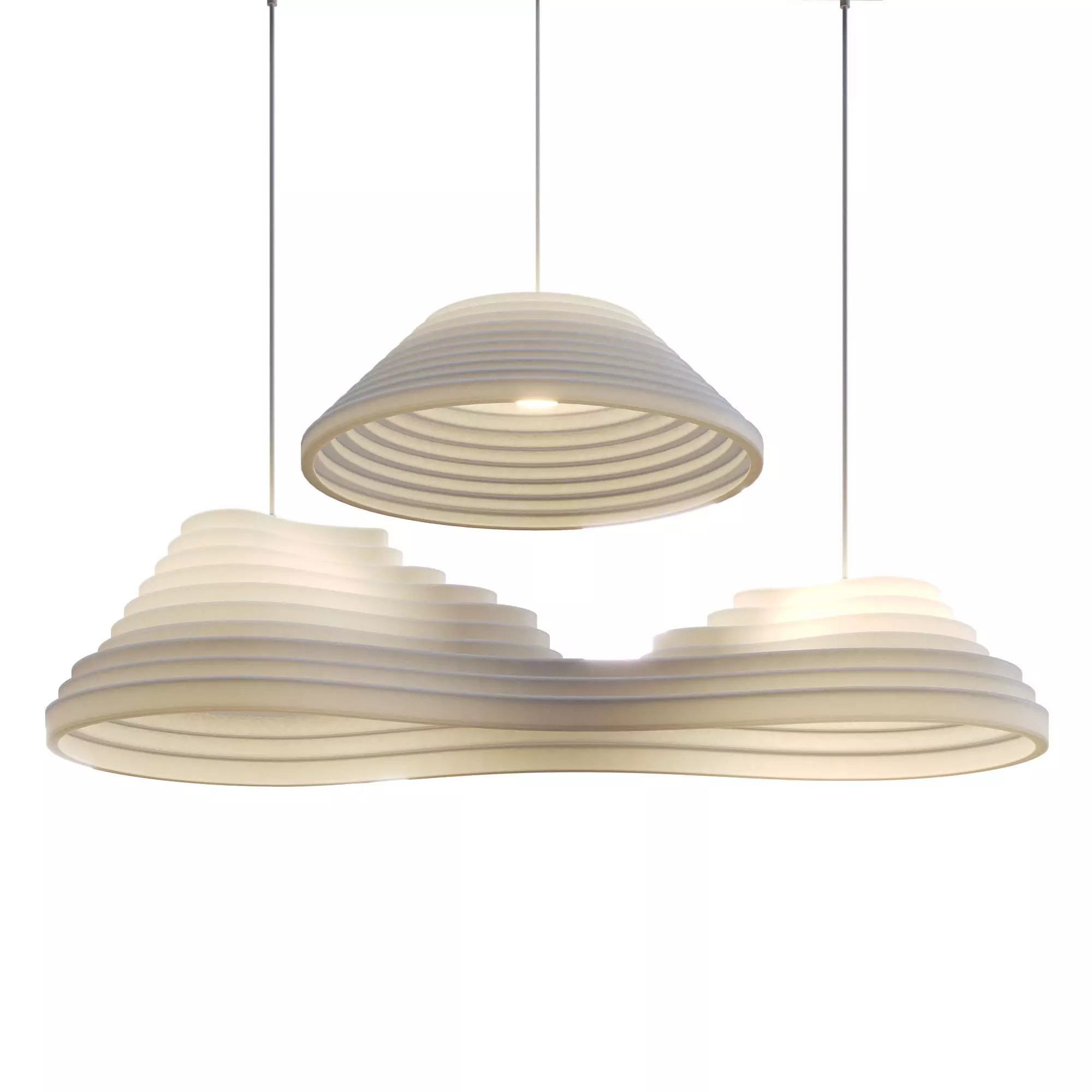 Acoustic Pendant Lamp: Rice Field 70Enhance your space's acoustics and aesthetics with the Rice Field 70, a compact and functional acoustic pendant lamp. Inspired by the asymmetrical shapes of Asian rice fields, this lamp is crafted from Basotect melamine foam, a highly sound-absorbing material that ensures a quieter environment.