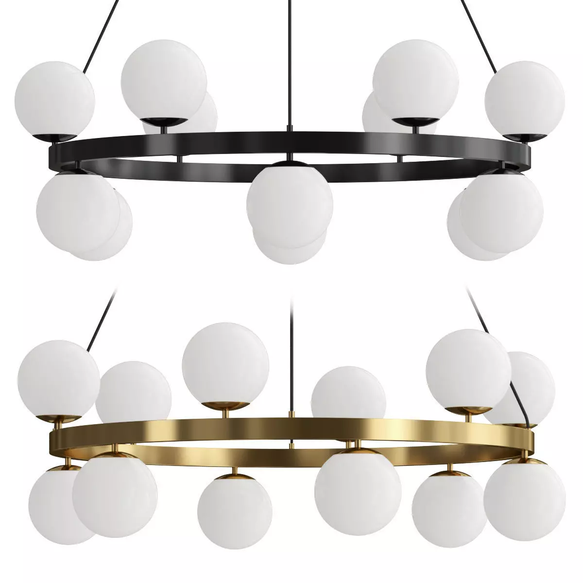 This is a high-quality 3D model of the Sanne Black Chandelier, a bold and sophisticated lighting fixture. The model accurately captures the lamp's unique design, featuring a large, circular metal frame from which multiple spherical, opalescent glass globes are suspended. The use of a sleek black finish on the frame creates a striking visual contrast with the soft, glowing spheres, making this chandelier a perfect focal point for any modern interior.