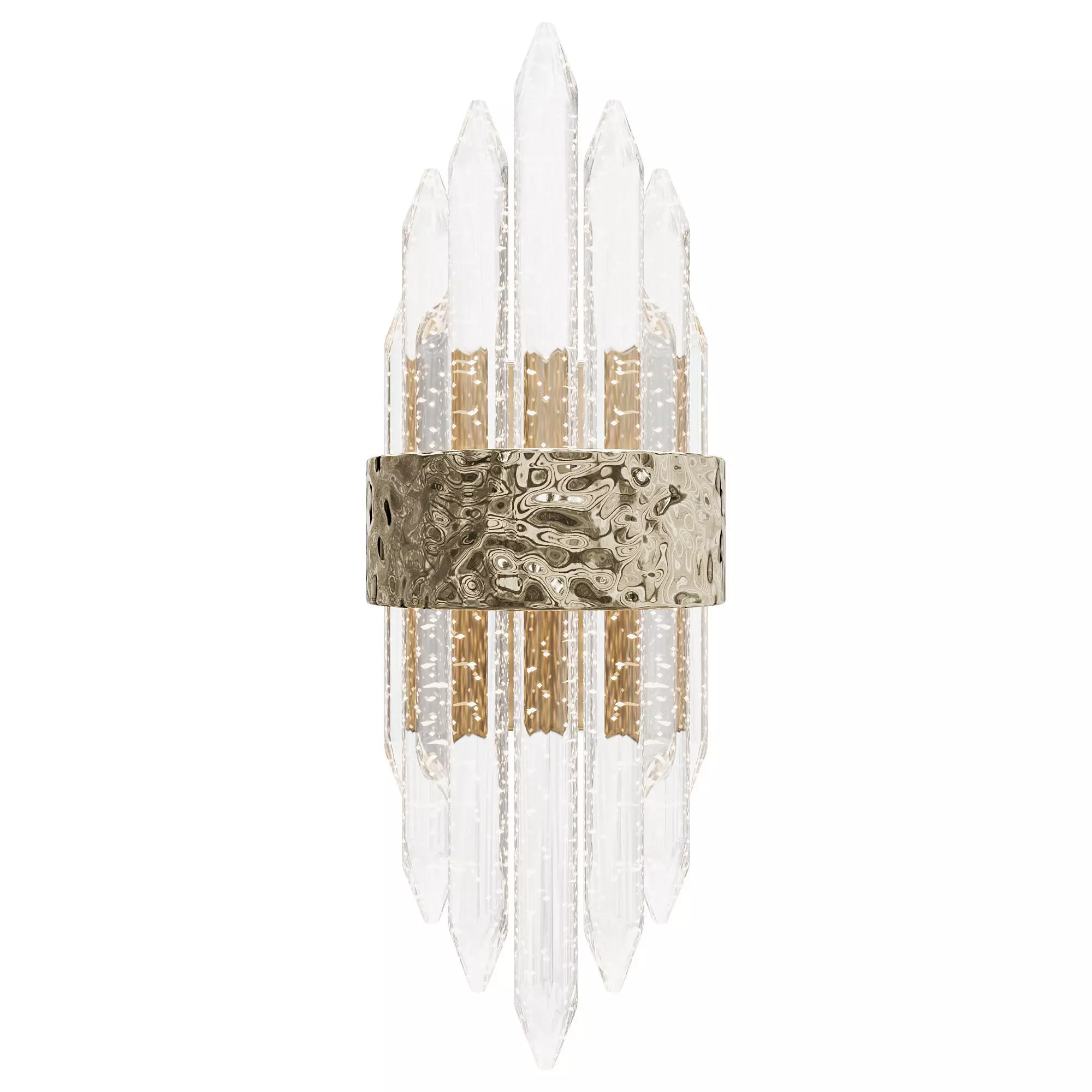 The model was created in version 2022 and saved in an earlier version 2019.The OBJ format is also present.There are no third-party plugins, all elements are named by their names.For Corona render, it is recommended to install version 1.5 or higher, since the glossiness of materials is configured taking into account PBR,(SCENE IN MILLIMETERS)Height: 500 mm. Width: 130 mm. Length: 180 mm.A stylish sconce with a glass shade in the form of oblong crystals embodies the simple elegance of glass and the luxury of gilded metal. A beautiful sconce in the interior looks incredibly luxurious - soft diffused light and original design unobtrusively decorate the space. You can install a sconce above the bed in the bedroom, near mirrors and paintings in the hallway or corridor. There is a place for this designer lamp everywhere. A spectacular sconce in the living room will create an intimate atmosphere when the chandelier is turned off and will highlight any decor placed on the wall. The model is also presented in chrome.